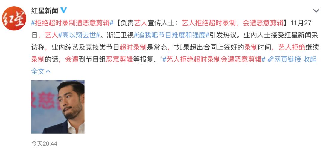 根据百度百科显示,从11月26日8时30分开始高以翔录制《追我吧》,一直持续到次日1时45分,工作时长近17个小时,艺人陈伟霆在近期采访中称,「每次收工回酒店都是凌晨6、7点」,红星新闻透露,「艺人拒绝超时录制,会遭恶意剪辑」。
