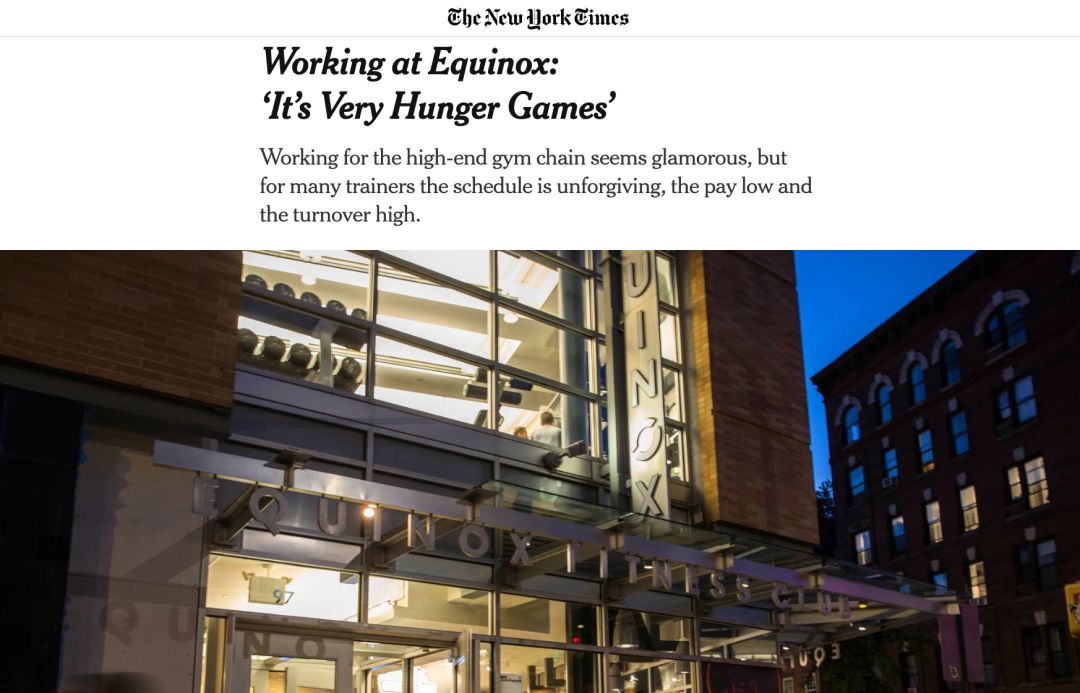 纽约时报于12月5日发布了《Working at Equinox: ‘It’s Very Hunger Games’》,指出在Equinox工作,堪比弱肉强食的「饥饿游戏」。文章内容,从Equinox教练薪资低晋升慢,业绩压力大超负荷工作,以及Equinox压榨教练薪资,这三方面展开叙述这场「饥饿游戏」。