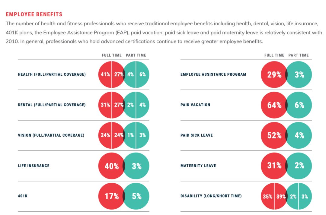 和中国健身教练难题类似,美国的教练工作,可能没有看起来那么好。不止Equinox一家健身房,包括24Hour Fitness、Crunch Fitness等在内的连锁健身房,都收到有关薪资拖欠的法律诉讼。而美国健身房的教练们,在阳光的外表下,也都有自己的焦虑困惑。首先,以教练是运动损伤高发人群来说,健康保险并没有全面在教练中落实。根据ACE的一项调查显示,在全美拥有健康保险的全职教练占比仅有41%,而美国劳工局的一项调查显示,扭伤、割伤、骨折是教练常见的职业损伤。然而,Bally Total Fitness的教练曾在采访中透露,教练必须每周进行35次课程教学,才能获得健康保险,如果在中途请假会视为无效。![]()