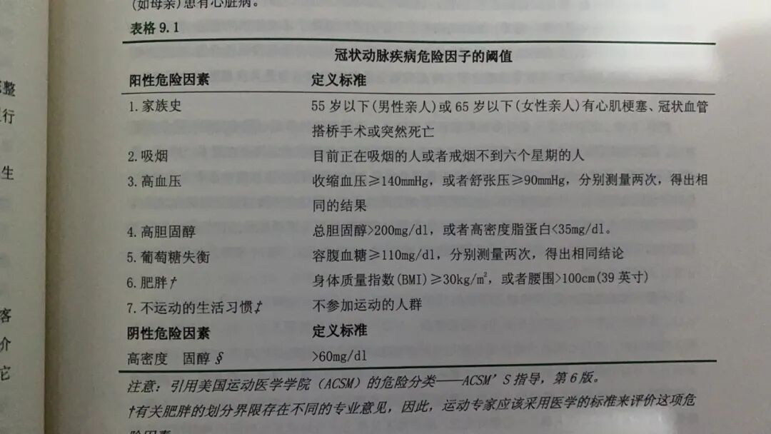 比如,美国运动医学会的危险分类指导,过去两个月不参与运动,即被视久坐不动者,与遗传史、吸烟、高血压、高血脂、血糖失衡、肥胖和高年龄并列为冠状动脉疾病风险因子。当风险因子等于或多于两个时,则为中等危险评级,应当规避代谢当量大于6的运动。