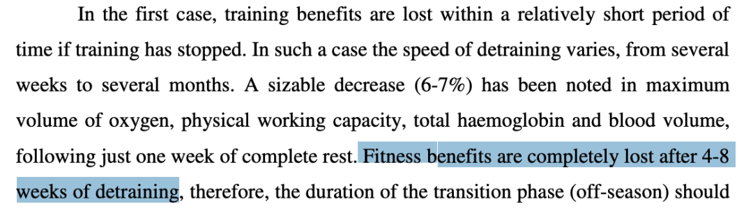 举例来说,赛季结束,为消除身心俱疲的状态,运动员在新赛季前往往会休假数周,这称之为过渡期(transition phase)。而移除训练刺激过久,过渡期末运动员也时常遭遇体能水平下降。