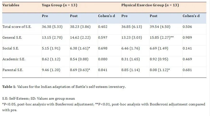 实验对比了锻炼前后,瑜伽与体育课对学生的自尊提升,并将自尊细化为总体自尊、社会自尊、父母自尊和学校自尊三个方面。