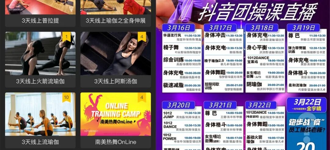 比如,一兆韦德和威尔仕每周课表中4~5天包含瑜伽课程,而超级猩猩最新一期4月6日-9日的8个线上训练营课程中,瑜伽营共计有6类。