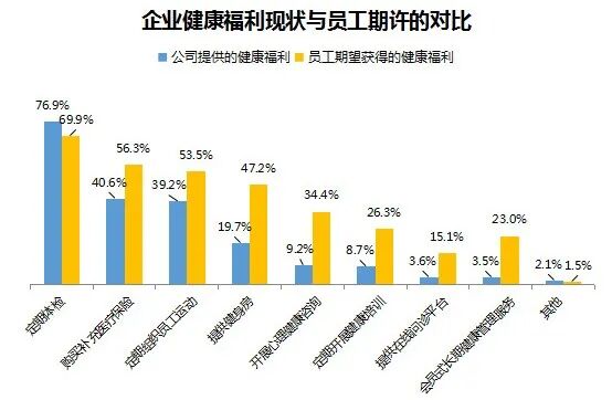 然而,就目前情况而言,只有30%公司提供健康福利,远低于员工预期。期待落差最明显的几个方面,包括提供企业健身房,远程医疗服务,以及会员制长期健康管理服务等福利。