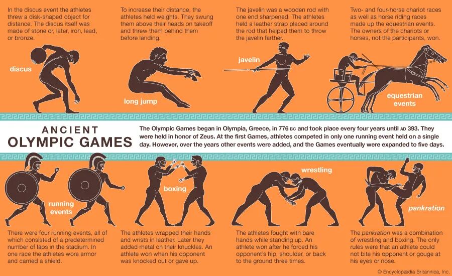 公元前776年,伯罗奔尼撒的统治者伊菲图斯在古希腊城市奥林匹亚举行了第一届古代奥林匹克运动会。最初的比赛项目只有田径,随后增加了摔跤、拳击、赛马、战车赛等项目,可以看到很浓厚的战争色彩。