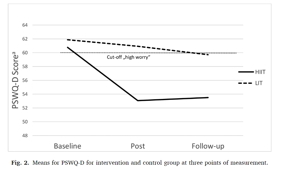 早在2003年密苏里大学研究发现,高强度运动在训练结束30分钟后能最有效地减少参训者的焦虑 [1]。在2020年12月,宾夕法尼亚州立大学心理学家对33名广泛性焦虑症患者展开研究,发现在HIIT训练组和较低强度训练组(LIT)都对焦虑症有干预效果,HIIT组的效果是LIT组的两倍 [2]。