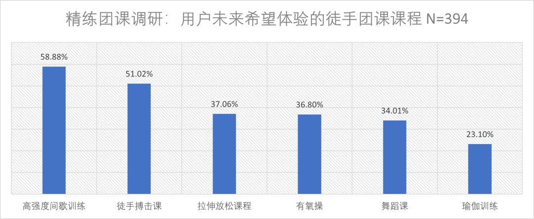 其中超半数受访者选择30分钟的徒手HIIT课程、45分钟的徒手搏击课以及借助战绳、药球等小工具心肺挑战课程。
