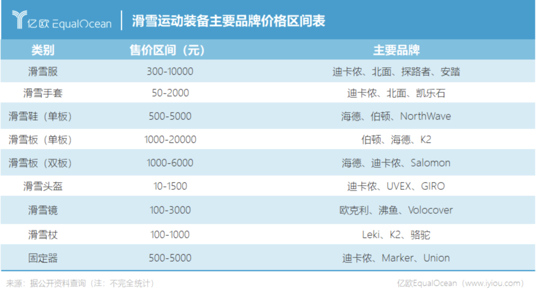以个人装备为例,根据亿欧整理的主要品牌价格区间表来计算,一套包括滑雪服、滑雪板、滑雪杖、滑雪鞋在内的初级滑雪装备花费在3000-10000元之间;而一名滑雪发烧友选手,从头到脚一套顶级的装备在6万元以上,如果再热衷于购买联名款、限量款,价格还得翻番。