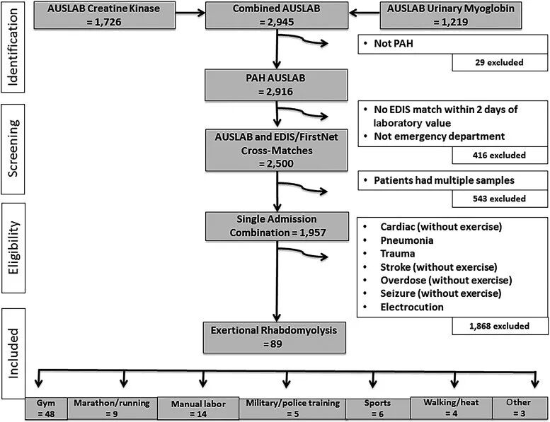 美国卫生研究院曾公开了一份2005至2016年间,澳洲权威医院 Princess Alexandra Hospital (PAH)的横纹肌溶解急诊趋势报告,并指出在1957例横纹肌溶解症病例中,因健身房锻炼引起的运动性横纹肌溶解是这些病例占据53.9%为主要子类别。