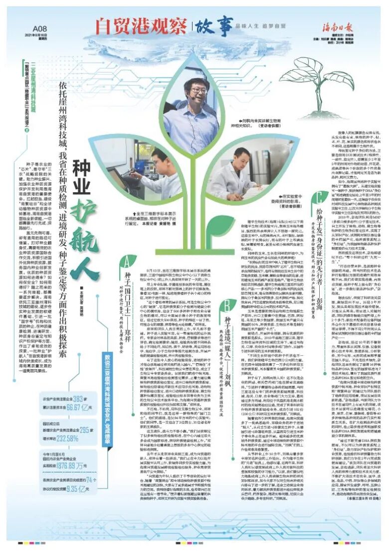 有了这张令人放心的检验报告,进境的种子才能合法地通过相关流程进入国内。“‘管得住’才能‘放得开’,科技城把生物安全摆在首位,成立了生物安全专家委员会。目前我们瞄准中转基地、南繁基地检验检疫检测鉴定需求,正着力建设集植物种质资源检疫鉴定、进出口植物种质资源库、植物检疫除害处理新技术应用示范基地、动物物种资源检疫鉴定、进出口动物种质资源库、微生物菌种保藏及鉴定、检验检疫标本馆等业务为主体的生物安全技术服务平台,为海南自贸港种质资源提供检验检疫科技保障和支撑。”郑祥说。