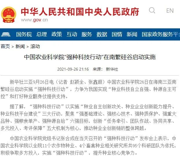 中国农科院启动“强种科技行动”