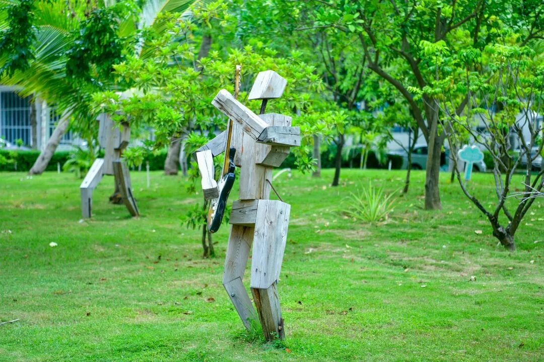 丛林里的木头人结伴摆出弹奏吉他的造型