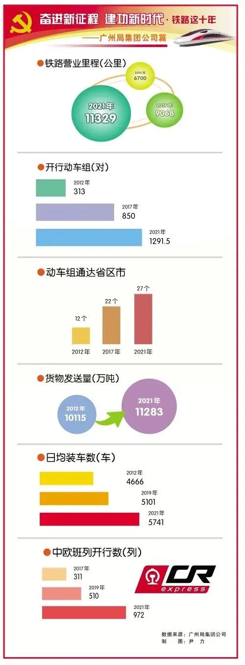 2012年底,广州铁路(集团)公司铁路营业里程为6700公里,其中高铁1494公里;十年后的2022年10月,广州局集团公司铁路营业里程达11411公里,其中高铁5391公里。