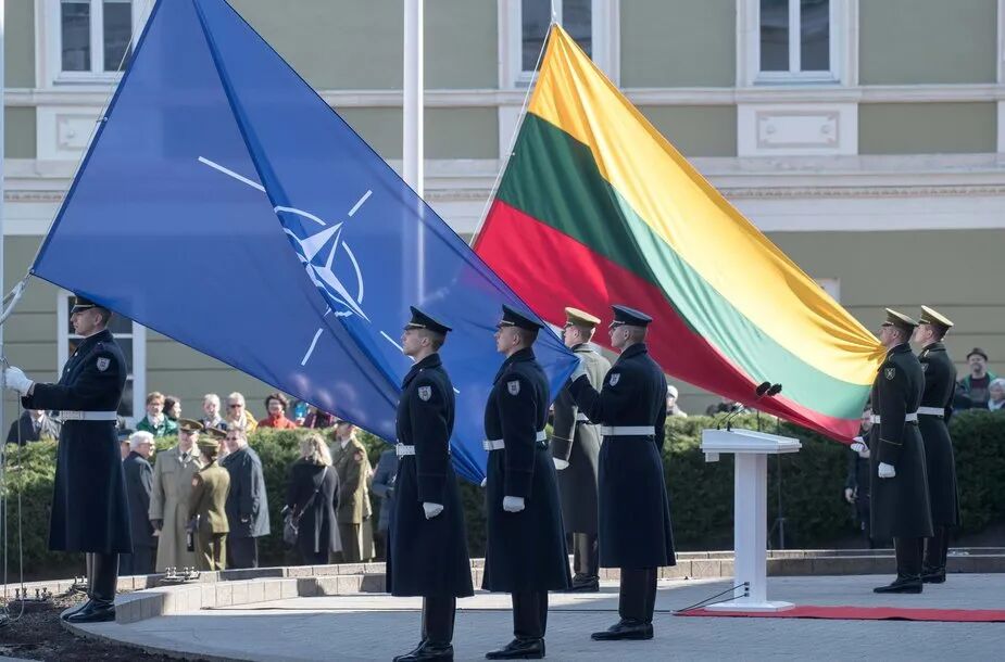 ▲资料图片:在立陶宛首都维尔纽斯,士兵们准备升起北约旗帜和立陶宛国旗。新华社发(阿尔弗雷达斯·普里亚迪斯摄)