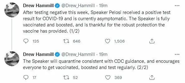 ▲当地时间4月7日,美国众议院议长佩洛西的发言人德鲁·哈密尔在推特上表示,佩洛西新冠病毒检测呈阳性,亚洲之行将推迟。