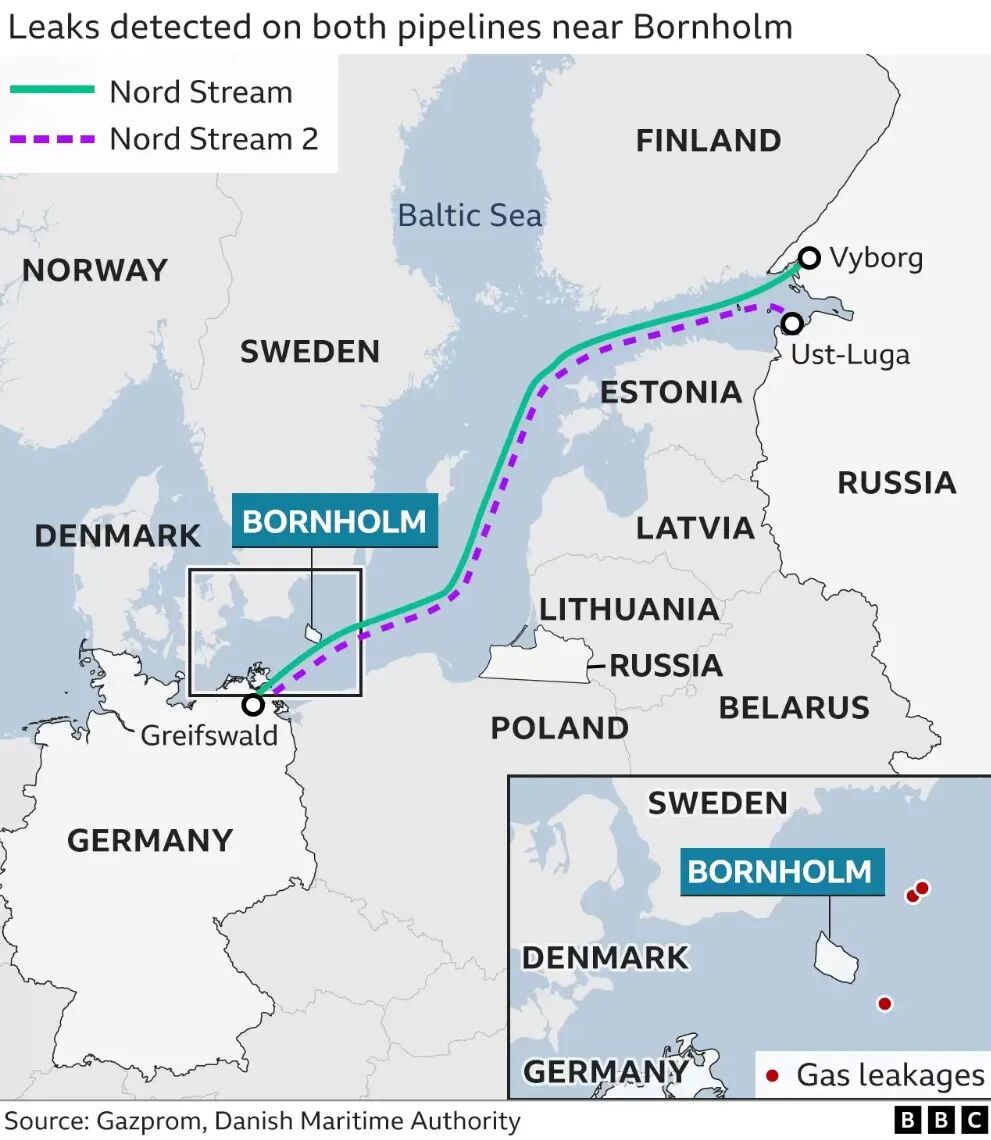 同时出事的北溪1号和北溪2号大致是两条平行的天然气管线,连接俄罗斯与德国,途径丹麦、瑞典附近海域,长达一千多公里。北溪1号因为故障目前停用,北溪2号则尚未输送天然气。乌克兰战争爆发之前拜登总统曾威胁,一旦俄罗斯向乌克兰动武,北溪2号天然气管道将被立即停止,并表示美国能做到这一点。