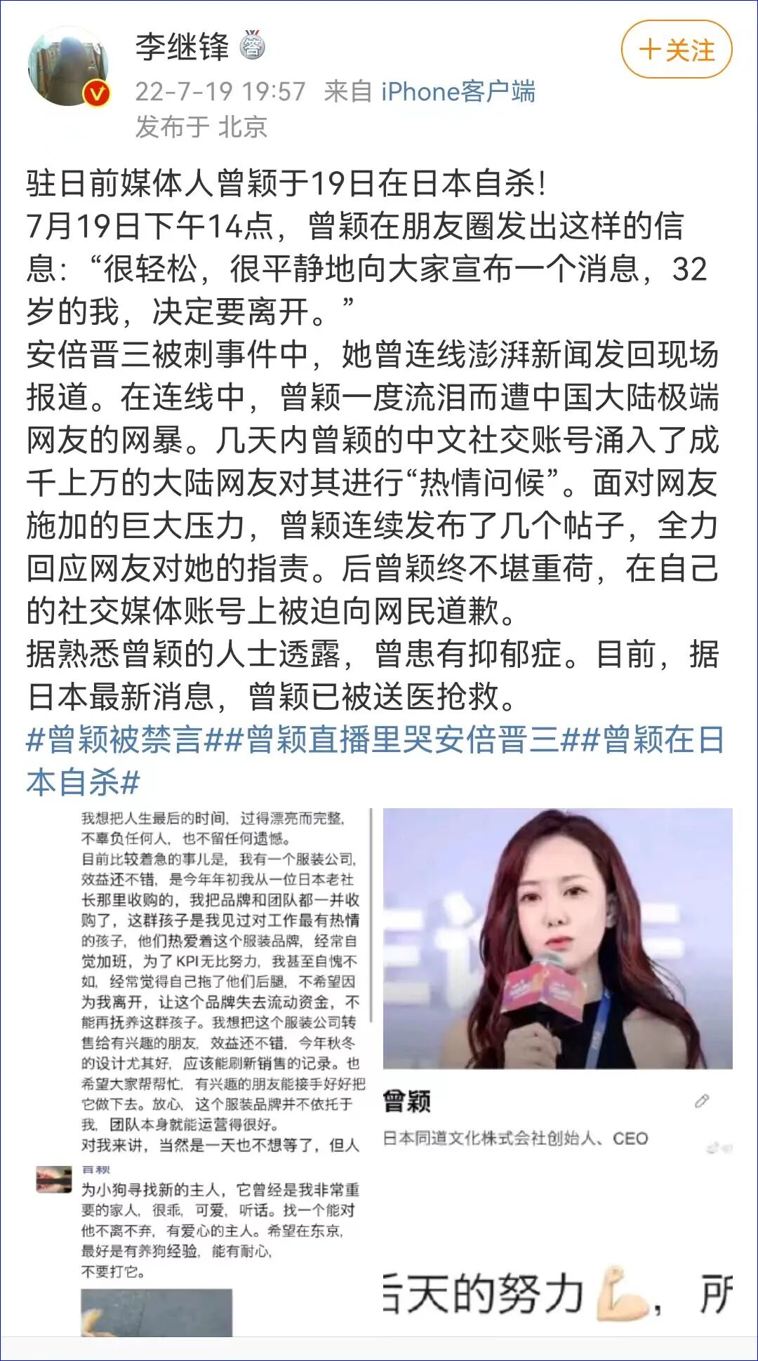 安倍遇刺后,身在日本的曾颖与澎湃新闻连线做报道时,一度哽咽,然后便遭受了如潮水般的网暴和辱骂。事后,曾颖表示了道歉,但并没有因此平息网络的声讨。7月19日下午,曾颖在朋友圈发文告别后,选择了自杀,随后被送医。