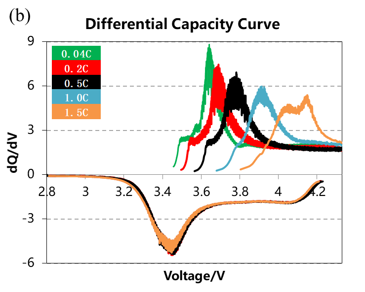 图3.电芯在5种倍率下充放电曲线(a)和微分容量曲线(b)