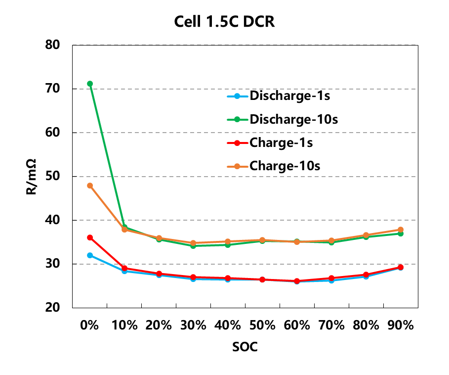 对电芯在充放电过程中进行不同SOC的DCR直流内阻测试,采用1.5C倍率放电10s,分别分析1s和10s的DCR变化趋势。从图4的结果可看出,随着SOC的不断增大,1s和10s的DCR都呈现出“浴盆曲线”的趋势。在脱/嵌锂过程中,由于电极材料的晶体结构变化和平衡电势曲线等材料本身特性,电阻结果与SOC状态具有显著相关性。在中段SOC状态下,材料的电势区域稳定,电池电压变化幅度小,表现出电池阻抗更低,而0%和90%SOC时,材料平衡电势迅速变化,表现出高电阻。