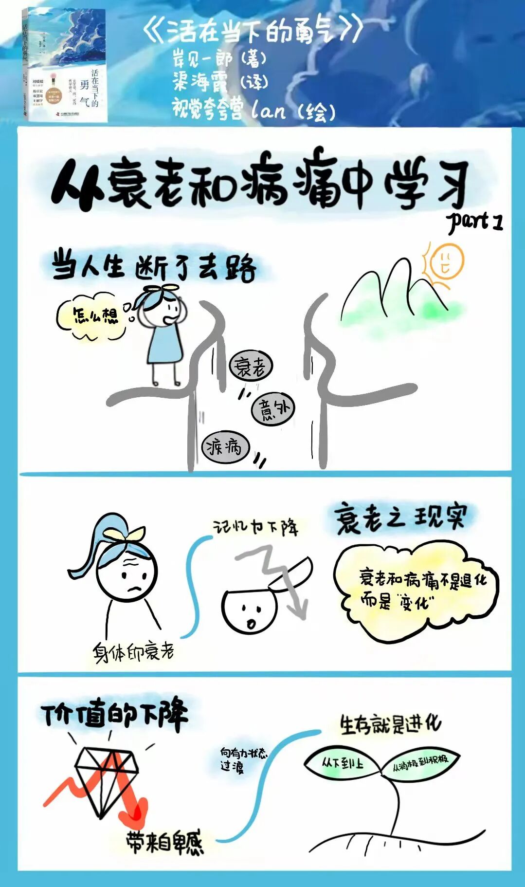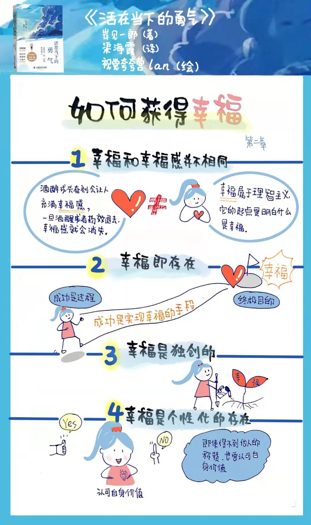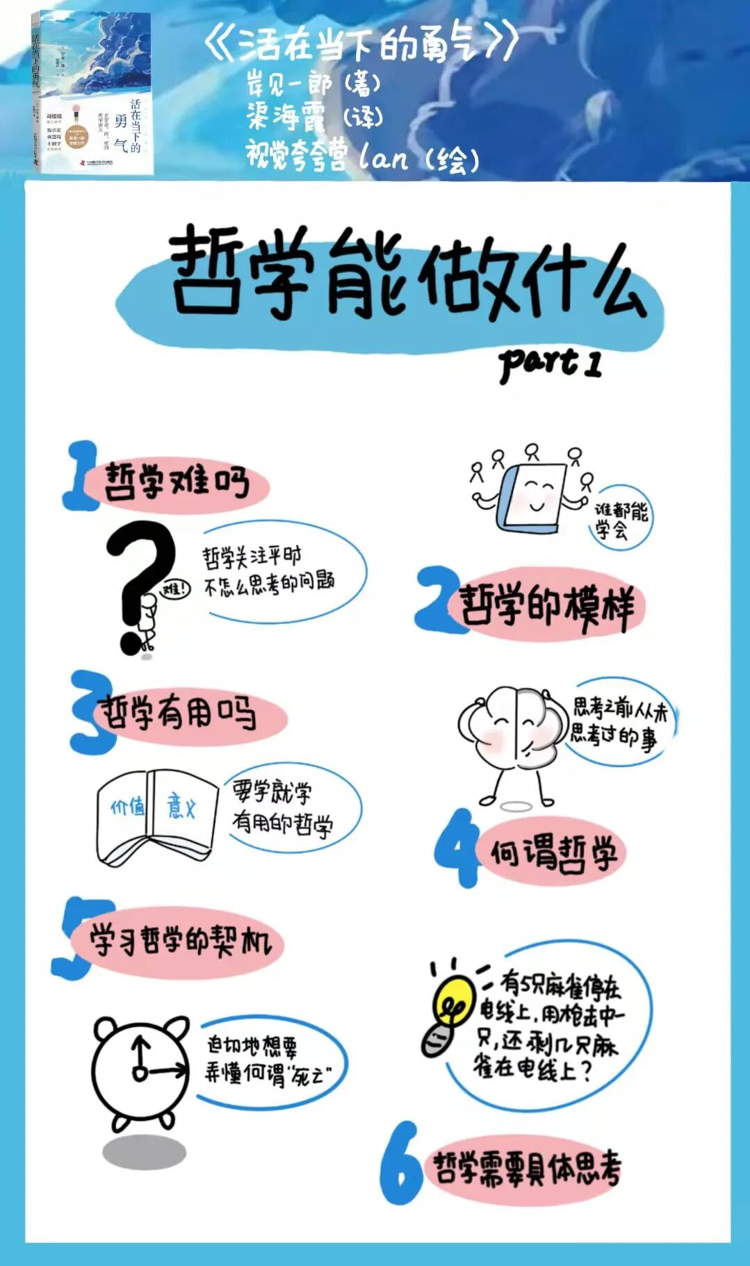 疫情突如其来,改变了我们的生活方式,也给无数人的内心带来了冲击。在后疫情时代,人们如何找到自己的幸福?岸见一郎全新力作,带你理解老、病、死。《被讨厌的勇气》畅销书作者岸见一郎全新力作。北大法律硕士、《超级演说家》总冠军刘媛媛暖心推荐,中国科学院心理研究所国家公务员心理健康应用研究中心主任祝卓宏教授,美中心理治疗研究院 |“慧正念” 创始人、斯坦福医学院精神与行为科学系临床副教授童慧琦,人气创业课《创业反常识》导师王润宇深读推荐;本书是日本作家岸见一郎继《被讨厌的勇气》《幸福的勇气》等“勇气系列”之后的又一新作。全书共分6讲,分别从“哲学能做什么”“如何获得幸福”“人际关系是烦恼之源”“从衰老和病痛中学习”“死亡并非终结”“活在当下”讲述了哲学在人生中的重要意义,获得幸福的方法,人际关系的处理,面对衰老、疾病和死亡的正确态度以及真实活在当下的重要性。 视觉笔记 by lan