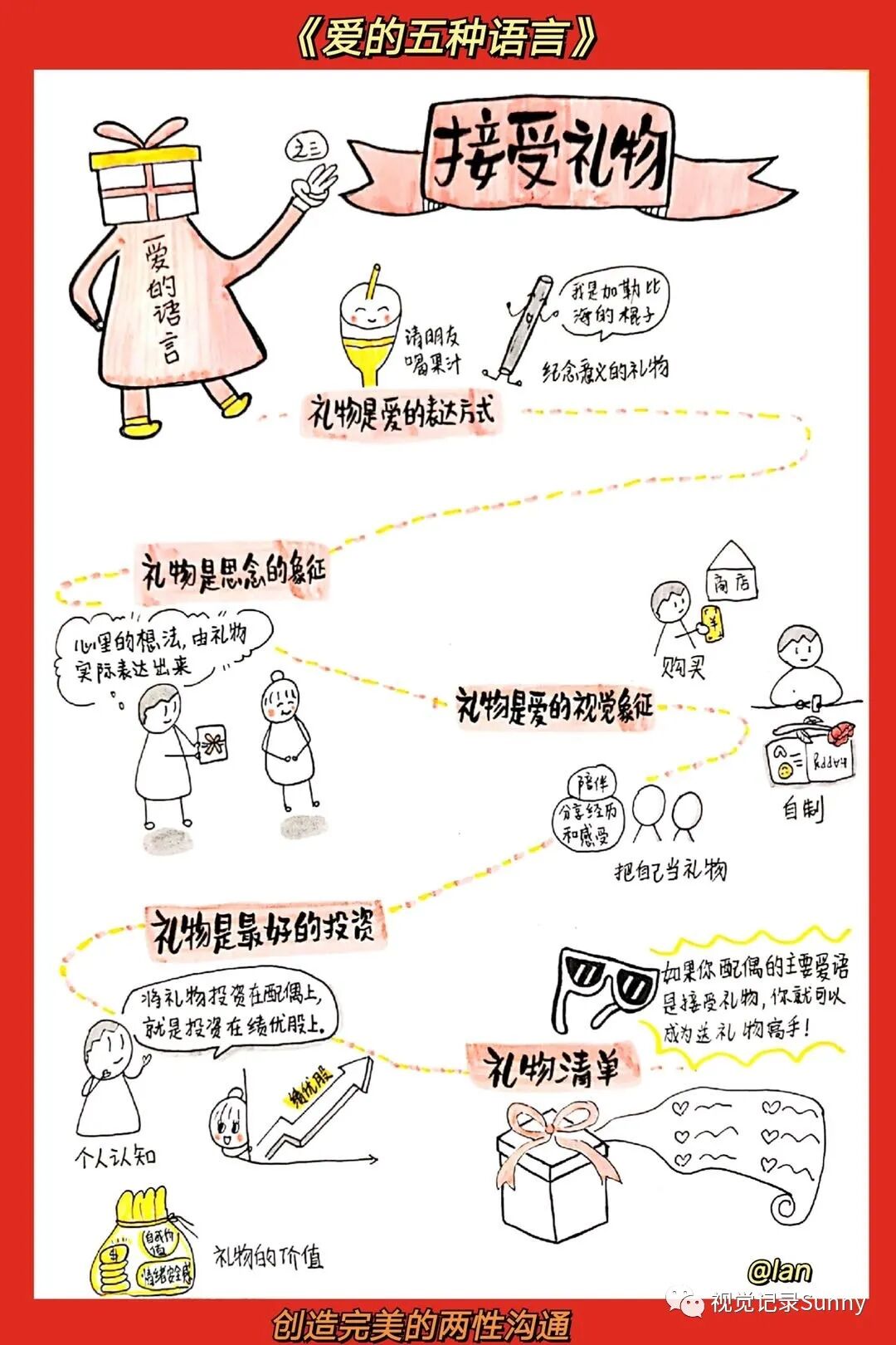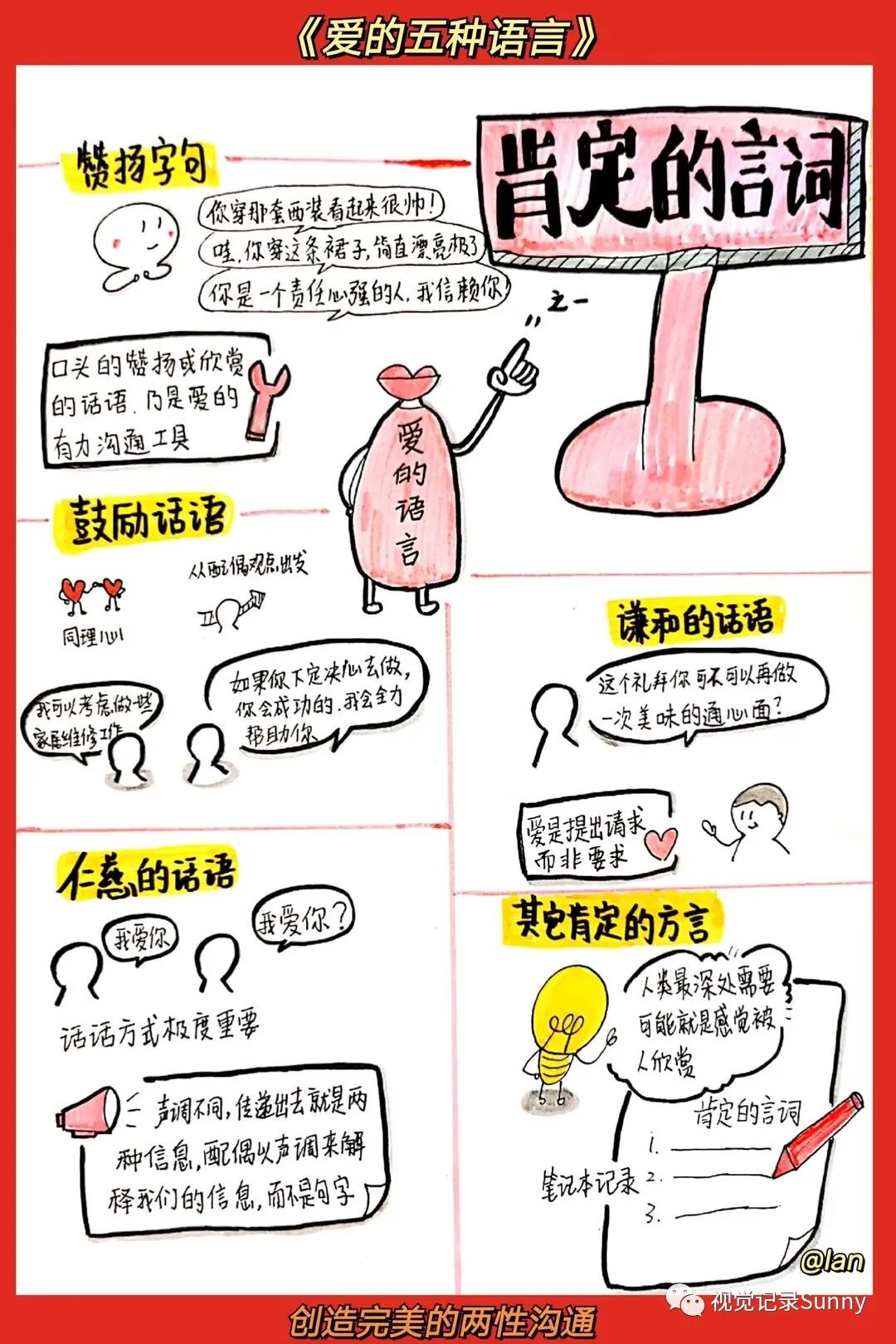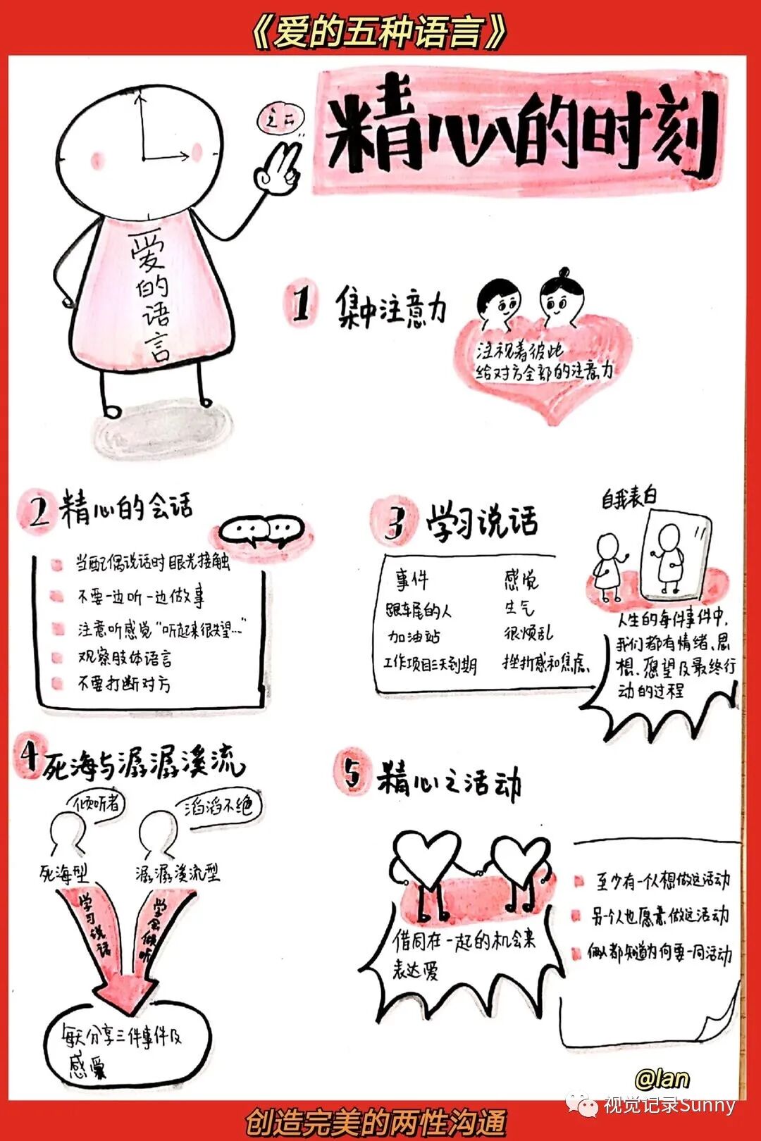 每一个人都有一个情绪的爱箱,只有当这个爱箱填满了的时候,人际关系才能发展。然而,不同人的爱箱需要用不同的语言来填满。查普曼博士发现人们基本上有五种爱的语言:肯定的言词、精心的时刻、接受礼物、服务的行动、身体的接触。