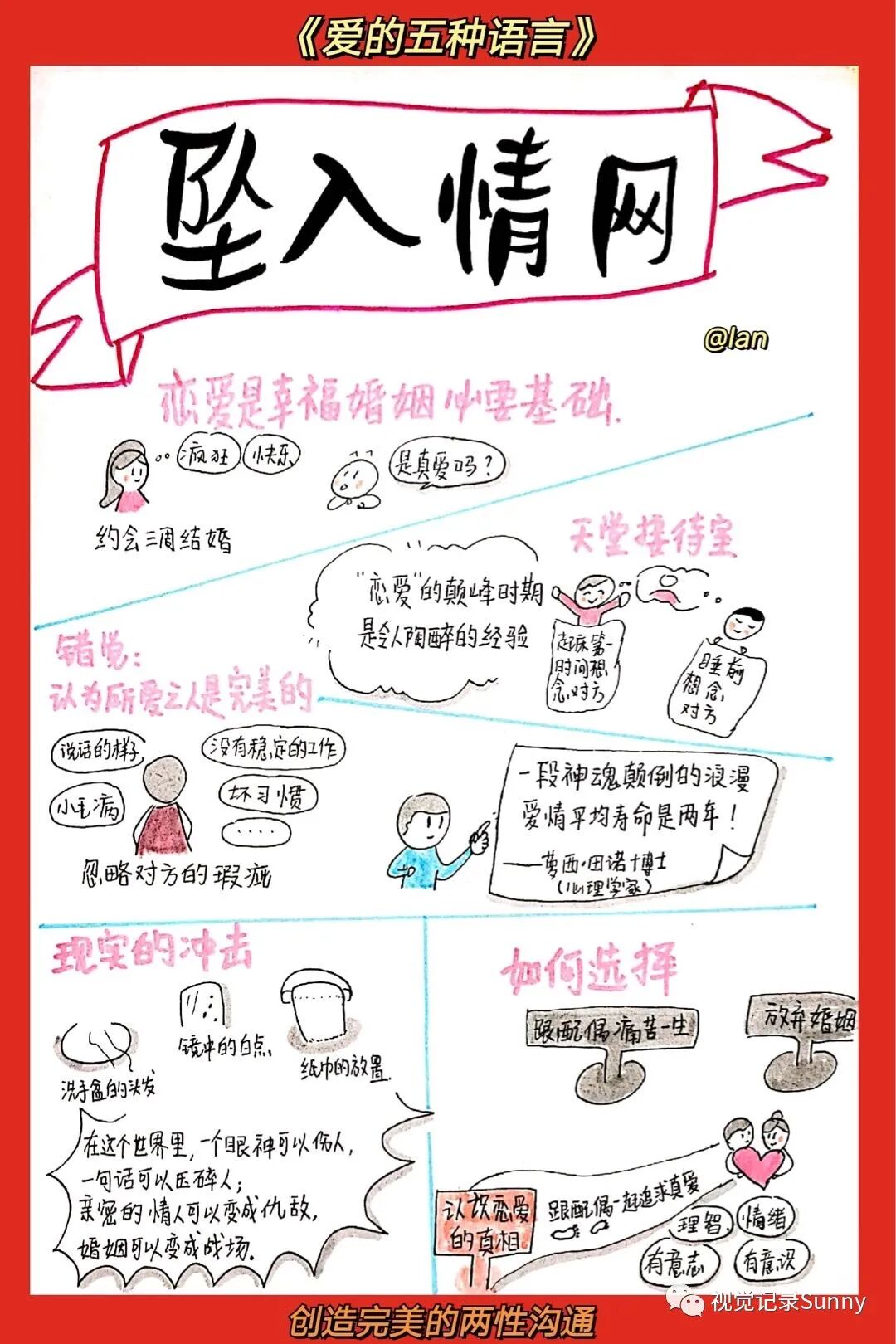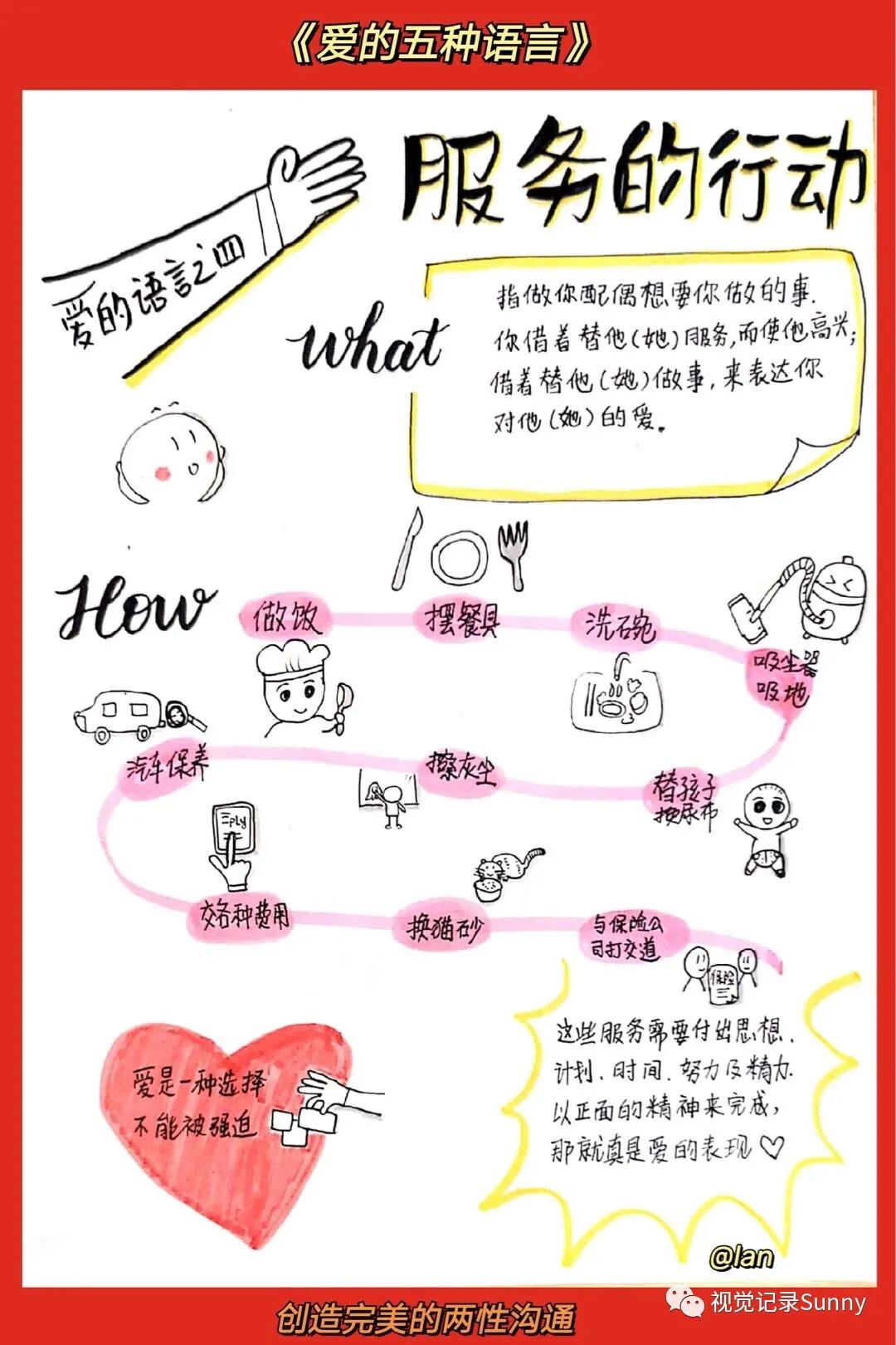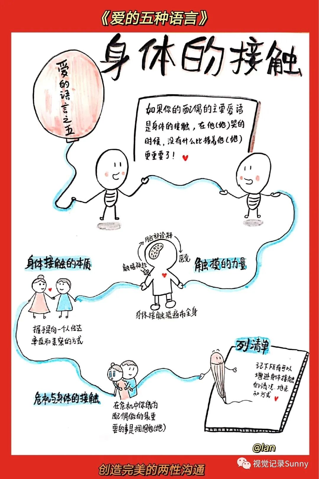每一个人都有一个情绪的爱箱,只有当这个爱箱填满了的时候,人际关系才能发展。然而,不同人的爱箱需要用不同的语言来填满。查普曼博士发现人们基本上有五种爱的语言:肯定的言词、精心的时刻、接受礼物、服务的行动、身体的接触。