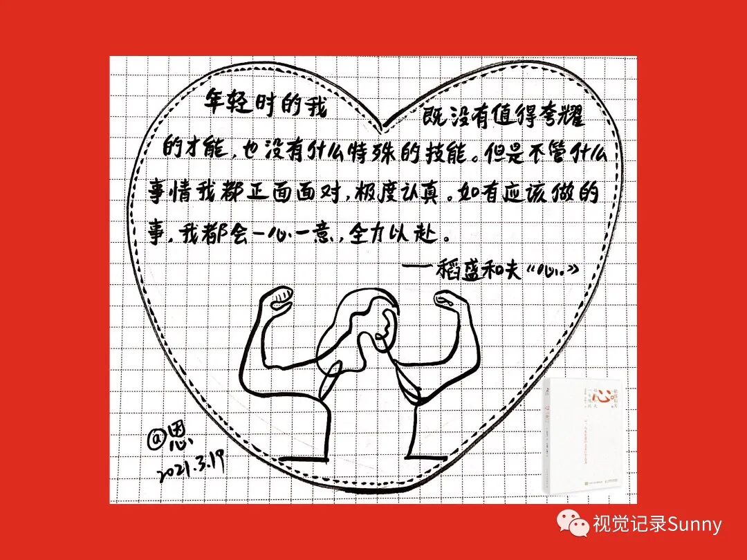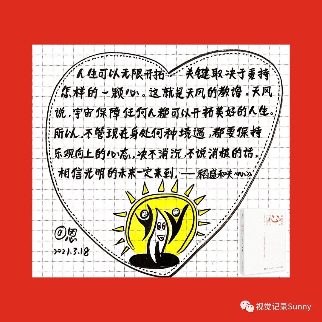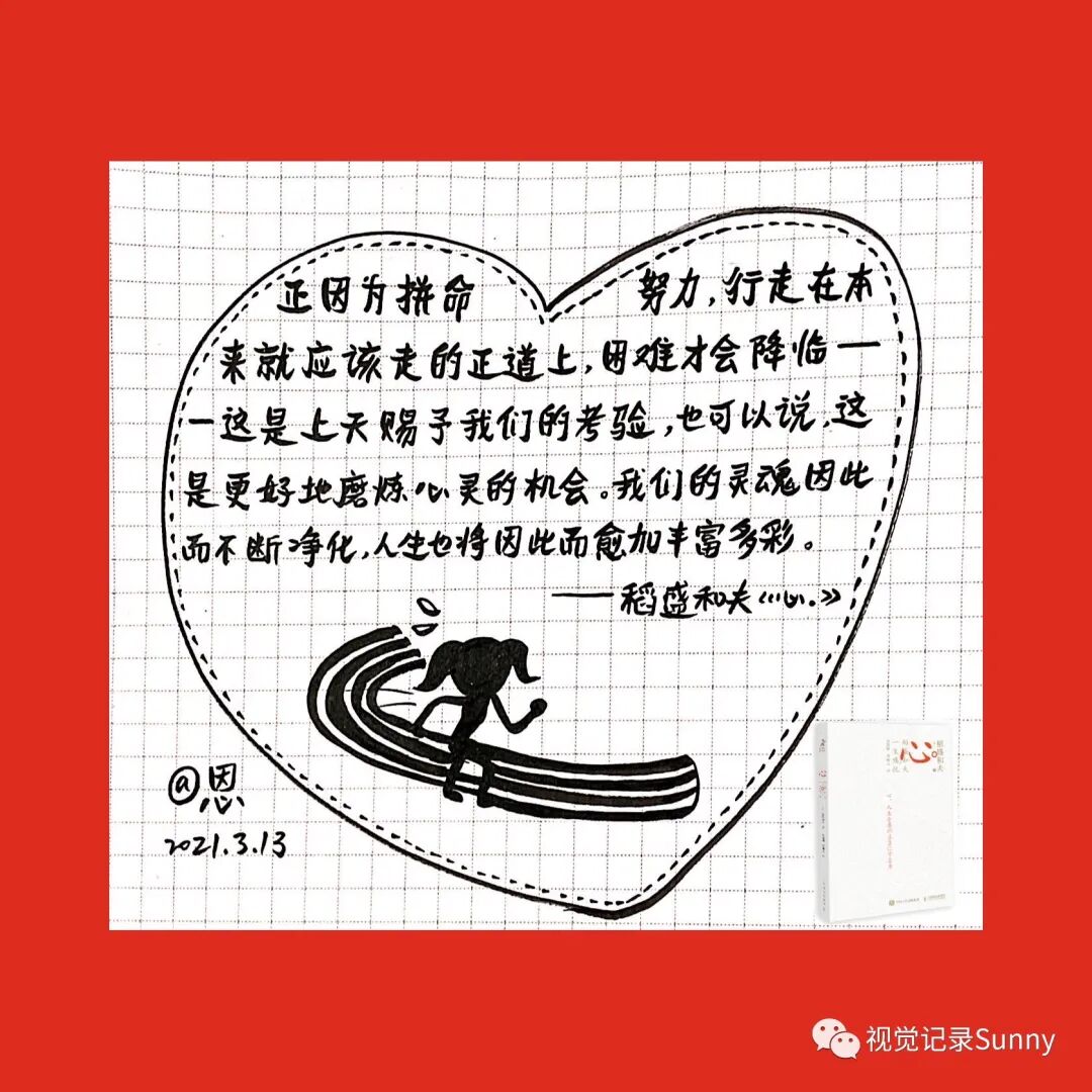 3月份《心:稻盛和夫一生的嘱托》金句画书打卡活动,不知不觉也坚持打卡满21天啦,以下图片是21天的手绘金句卡片,看着这些手绘视觉记录还是蛮有成就感的,感恩遇见Sunny老师,感动聚在夸夸营,夸夸营,一起赢,值得拥有!