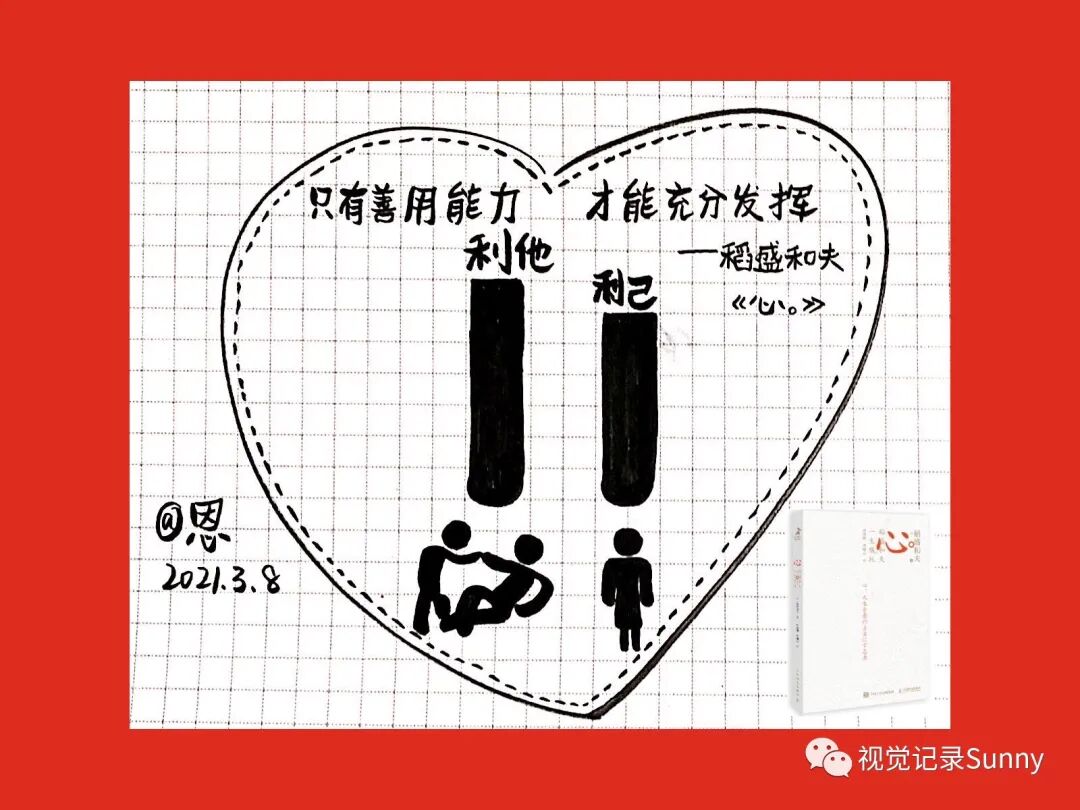 大家好,我是恩,一名在泰国任教两年的汉语教师。2020年刚回国注意到了Sunny老师,兴趣爱好碰上新视角新方式的输入与输出形式-视觉笔记,12月份正式加入了Sunny老师的视觉笔记训练营,打开了新世界的大门,被Sunny老师“时间看得见自己的努力”,“你的努力终将成为别人的望尘莫及”,“视觉笔记点亮生活”,“想就是问题,做就有答案”金句不断激励着。兴致勃勃且一直持续坚持着写画,并参加了Sunny老师的视觉笔记夸夸营,到目前已经和夸夸营的伙伴一起走过了三个月,每个月的不同的主题学习,不断充满了惊喜。一月份的视觉元素的积累,二月份的英文花体字跟练,三月份的《心》画书,活动多多,气氛热烈,惊喜连连,伙伴们都说想要一直住在“夸夸营”,一起成长,一起学习,在高手群里没有个个都是高手,加入“夸夸营”是2021年最值得的事!
