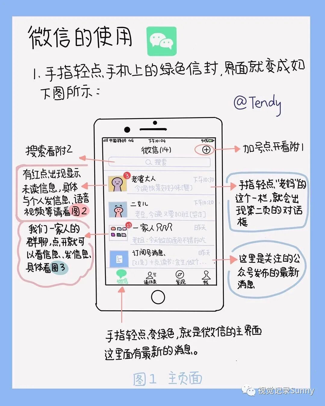 4、视觉笔记让我和家人的关系越来越亲密了,爸爸妈妈那个年纪的人对电子产品真的不熟悉,我用视觉笔记给爸爸画了微信使用说明。