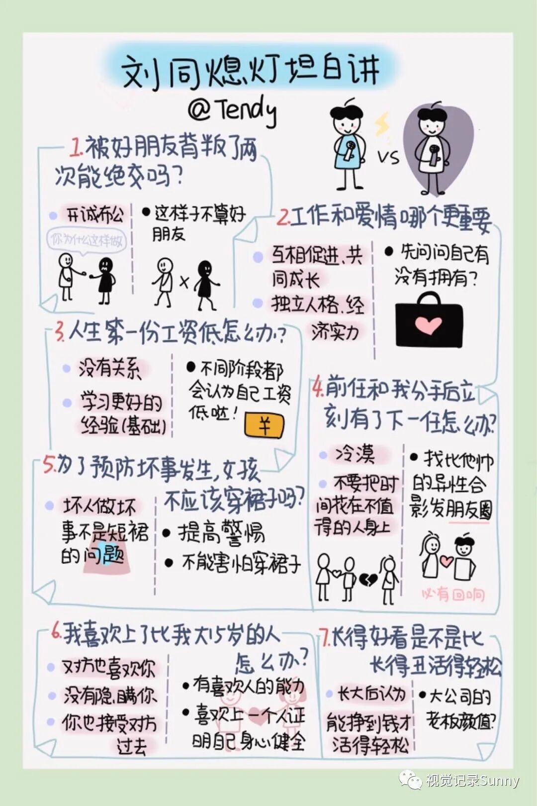 3、视觉笔记让我“追星”增加了被看见的可能性。一直喜欢作家刘同,画了关于他的视觉笔记,总能被喜欢他的读者围观,因此我的微博也有了被夸赞的评论。