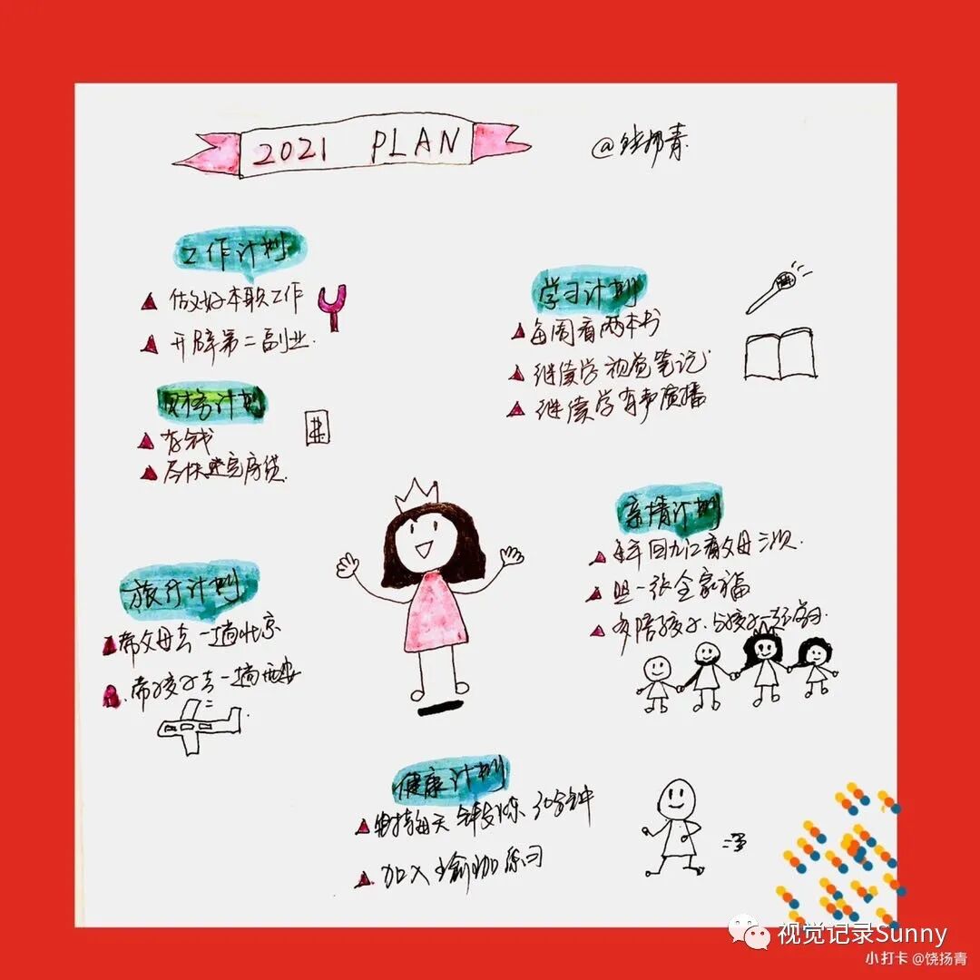 我不仅学习了视觉笔记的相关知识,还有了人生的很多第一次,第一次参加线上视觉同传,第一次参加画书项目,第一次制作红包封面,第一次将孩子的学习总结用视觉笔记来呈现,第一次在单位年度总结大会上尝试用视觉笔记来呈现……