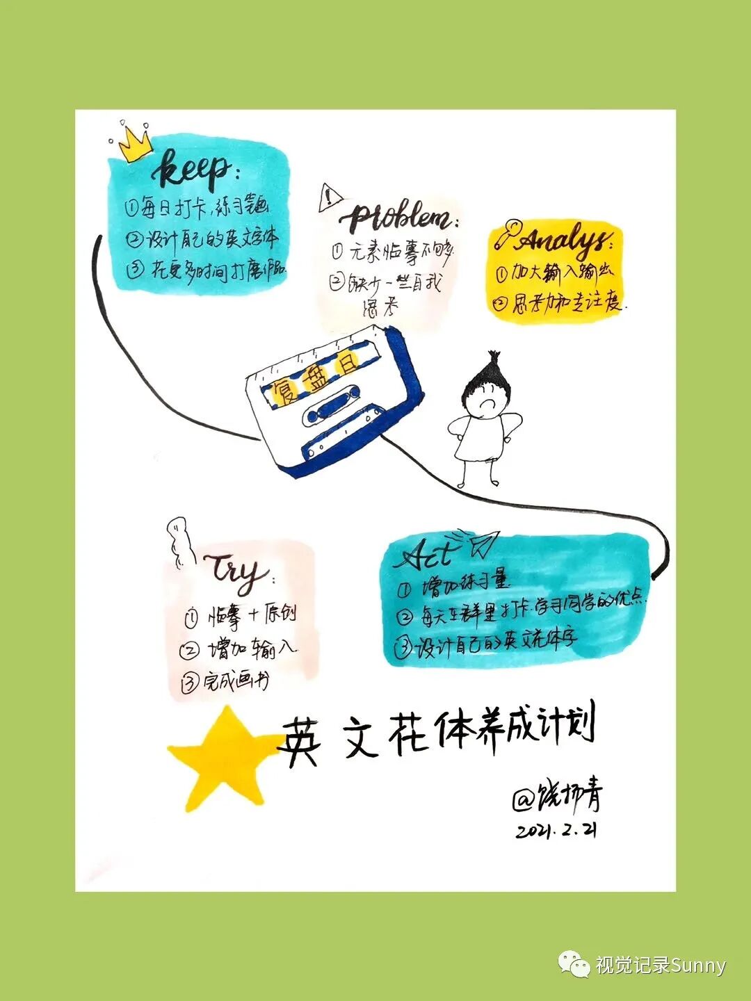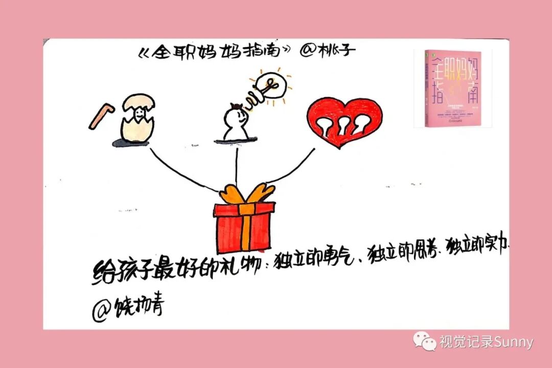 念念不忘,必有回响,在一次偶然翻看公众号的时候,竟然看到有篇推送,好奇的点开,立刻被Sunny老师的视觉笔记完全吸引住了,画风简约而不简单,那些可爱的小元素更是让我立马就爱上了。我马上就去关注了她的公众号,也添加了她的微信,说句不好意思的话,我刚开始的时候,以为我加的是小助理呢,后来知道是Sunny大咖本尊,激动了好半天。