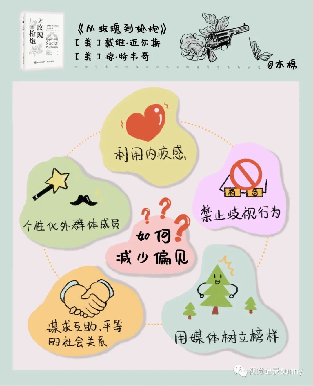 从亚里士多德开始,哲人们不断向我们揭示人是社会性动物。但这种哲学式的指引无助于缓解我们纷繁复杂的现实困惑,在这种情况下,实证取向的社会心理学恰好可以弥补这种不足,为我们刻画出社会性动物的细节。 戴维•迈尔斯和琼•特韦奇的Exploring Social Psychology以“社会思维”“社会影响”和“社会关系”为主题,清晰地为我们展示了近百年来社会心理科学对上述问题的回答。该书的独到之处在于它打破了传统大部头教科书的编写方法,将每个有趣的主题组织成10000字左右的模块,以符合人们长时注意的习惯时长,获得阅读的“完成感”。为了更加方便读者携带和阅读,我们在保留模块化编写优点的同时,在新版的改编中将500多页的原书按上述三个主题拆分为三个小本。 本书《从玫瑰到枪炮:心理学实证研究社会关系》,便来自Exploring Social Psychology的第四编——“社会关系”,涉及从炽热亲密的浪漫关系到冰冷凶残的种族屠杀在内的社会关系,包括人际吸引、助人、偏见、攻击、冲突与和解等。 视觉笔记 by 木棉