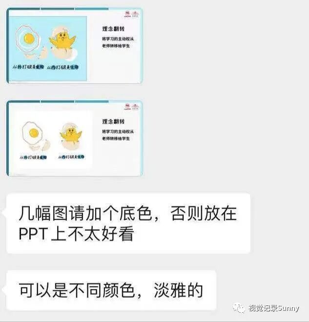 单独看,一副彩色的图,白色的底,清晰没毛病。但是我在图案设计的时候,没有考虑到他的应用场景——就是用于PPT,用于一个大的屏幕的展示。图片白底和甲方PPT的白底混在一起没有边际,显得图片不突出,也给甲方排版带来了不便。我恍然大悟Sunny老师在小白营直播和点评的时候经常会发出的灵魂拷问:你画之前要先想清楚——这副笔记是做什么用?给谁用?给谁看?结果不同,处理不同。以后要多多思考,做到精准设计。
