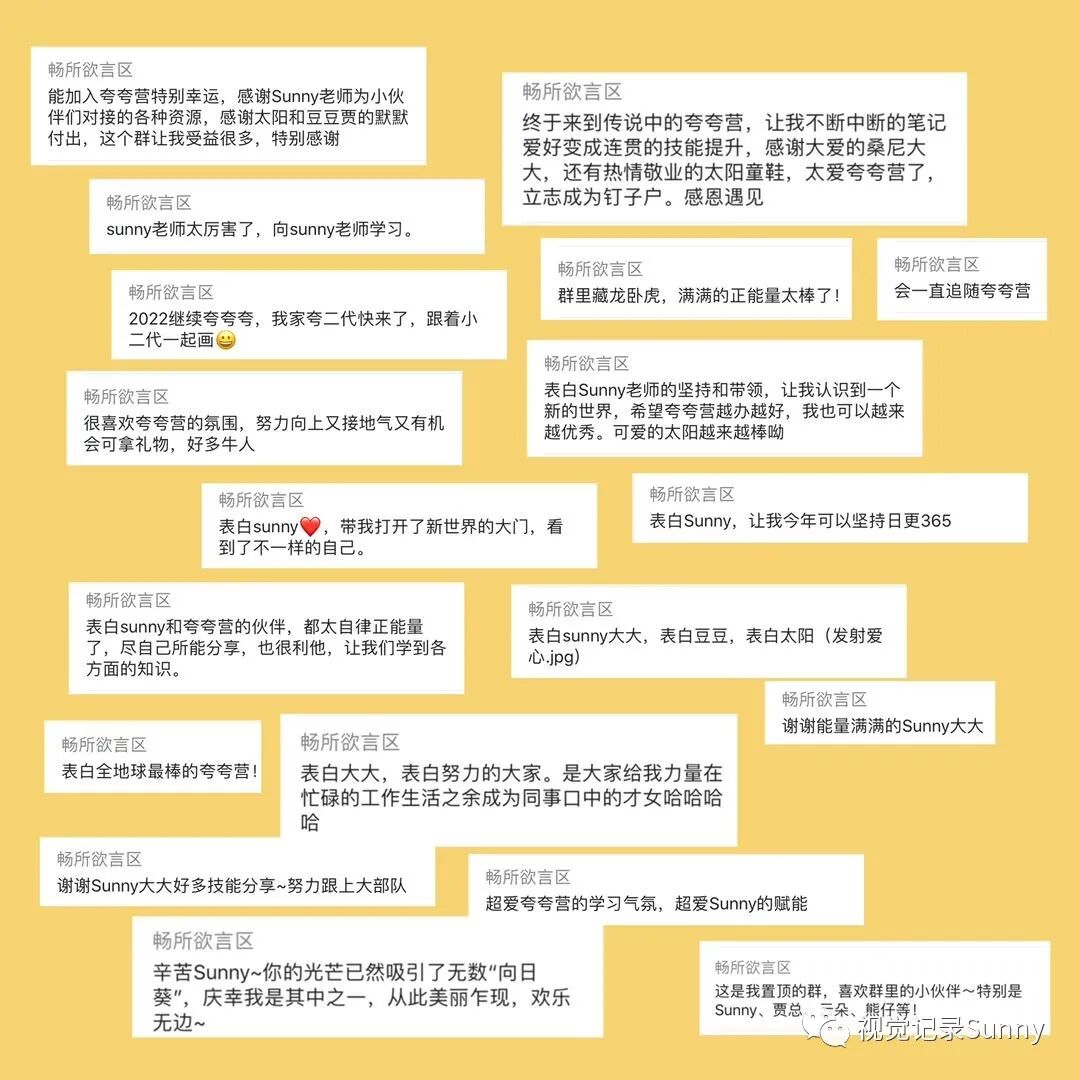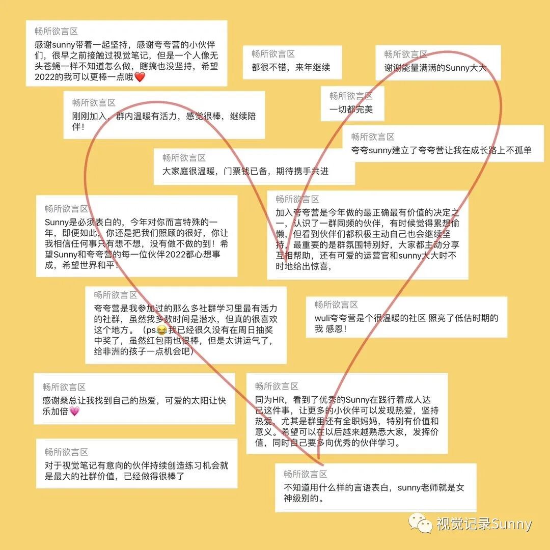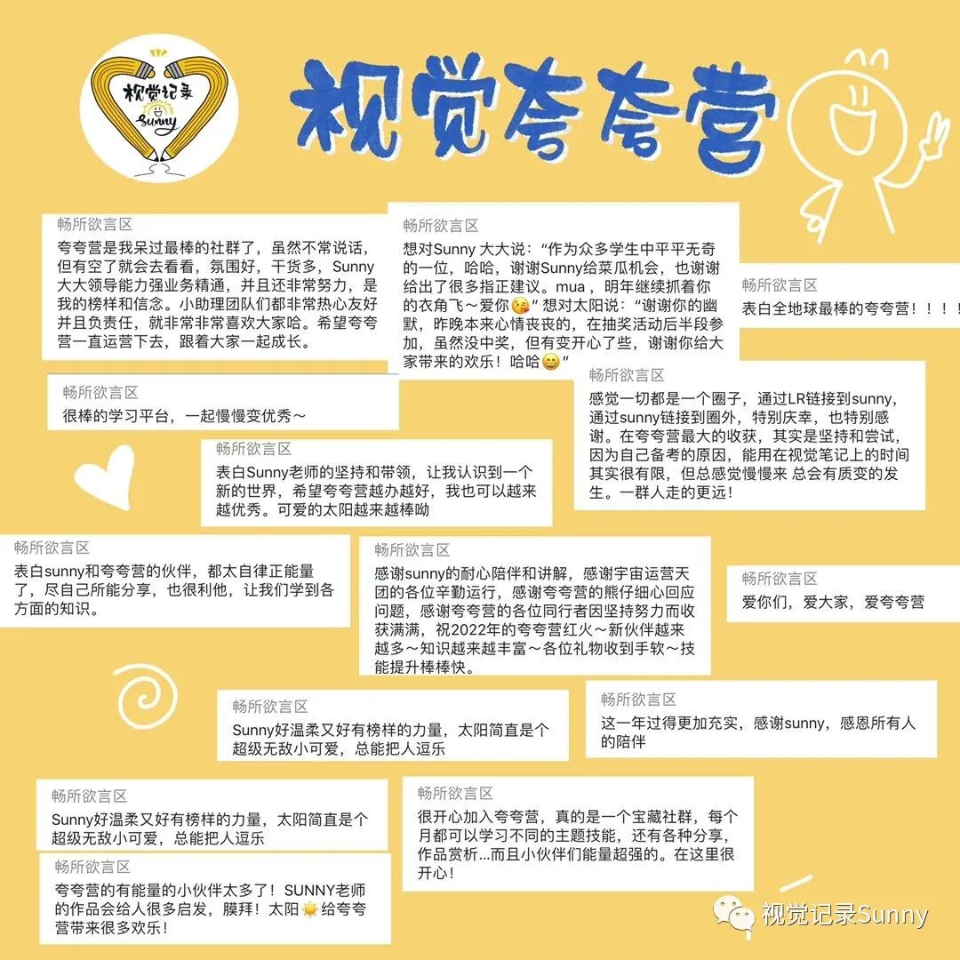 人的视野像手电筒,未知世界如茫茫黑夜。走在清凉黑夜里,大师们的智慧如闪亮的星星, 在头顶若隐若现,我抓紧自己的手电筒,照着脚下,一步步前行,偶尔见几个同路人,心生欢喜。——古典老师Hello,我是Sunny,一个野生的视觉记录师,同时也是一名外企HR。回顾2021过去的时间,我的身份,我的生活发生了翻天覆地的变化:前一天还在上班,隔天便休起了产假;从待产的大肚孕妇变成了新手妈妈;从自由支配时间,到每天疲于应对高需求的宝宝各种需求,但这一切都没有让我停下手中的画笔。那天我发了一张照片,怀里孩子,手里画笔,很多人都会发出感叹:Sunny,你不累嘛?我带着我亲爱的豆芽宝宝,背靠强大的幕后天团,为这个以视觉笔记为核心的社群持续努力着。当然,也带着夸夸营的伙伴们,在视觉笔记的道路上不断向前奔跑,每个人都在不同的方面努力有所积累和突破,像颗颗闪耀的星星,互相引领,持续发光。马上2021年就要画上句号,为了感谢所有夸夸营小伙伴这一年的厚爱,我和幕后天团的小伙伴们正在积极努力的筹备年会中,(咳,咳!据说还有还有现金奖励环节)希望给你们的2021,也添上精彩的一笔!大家敬请期待!2021年转眼就剩下最后2个月,但是并不意味着夸夸营社群运营的结束,而是新的开始,很多小伙伴在催促我:2022年的夸夸营什么时候开始招募,迫不及待想要参与啦!但是我还是希望2022年夸夸营能以更好的面貌呈现在大家面前,所以一直在不断的打磨细节,终于!全新的视觉夸夸营即将重磅推出!对视觉笔记感兴趣的你们,要不要来?夸夸营是2020年由野生视觉笔记师——我,首创的视觉笔记陪伴式社群,它一直被模仿,它从未被超越,它旨在带领同频伙伴们更有趣、有爱、有料地坚持做一件事,培养一个闪闪发光的技能。当然,夸夸营也为所有想拿起笔又怕自己手残的萌新伙伴们开放,通过引导鼓励式的打卡活动,帮助大家逐渐从小白蜕变成视觉笔记专业选手~12期主题带练:元素收集、画书、画海报、画头像、植物主题绘、软体字解锁,英文花体,手账,日历绘……28场直播同传(预计到12月31日,同传场数将达到50场),合作方包括:长沙图书馆、樊登读书、昆明烟草、中国微创业大会、新榜榜哥会,有赞新零售,中国企业法律顾问科技峰会……20场在线分享,主题包括:蒙特梭利教学;万物皆可“布尔逻辑”;短视频制作;护肤;减肥瘦身,一本绘本可以打造八节早教课;为什么要让孩子学美术;复盘与计划,如何用手机拍出好看得照片......24层画书项目大楼(预计到12月31日,楼层将达到30楼),完成了88本书籍9189张视觉卡片,合作方有(截止今日):人民邮电出版社 | 接力出版社 | 中国工信出版集团 | 机械工业出版社 | 人民大学出版社 | 麦格劳希尔 | 新曲线 | 新星出版社 | 蓝狮子 | 重庆出版集团 等30+次商稿合作,共有32位小伙伴通过视觉笔记技能成功变现。除了这些惊艳的数字,在夸夸营还有形式丰富成果多彩的共创项目: