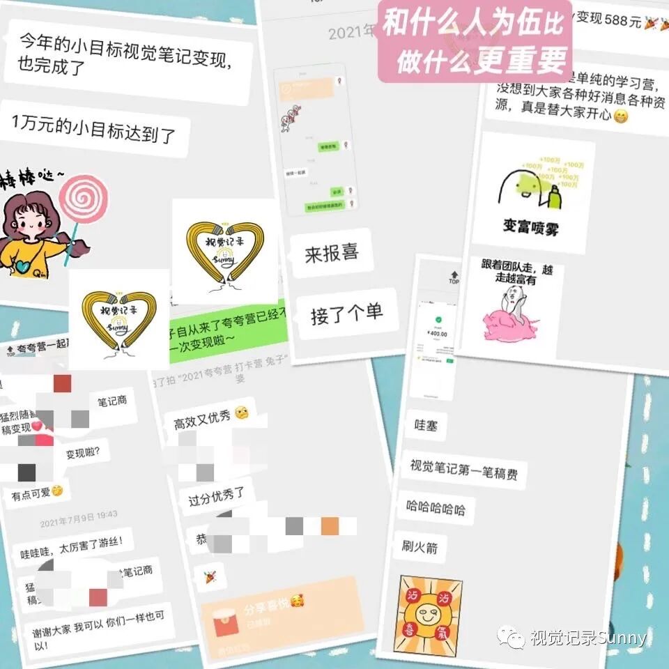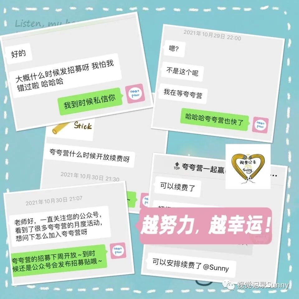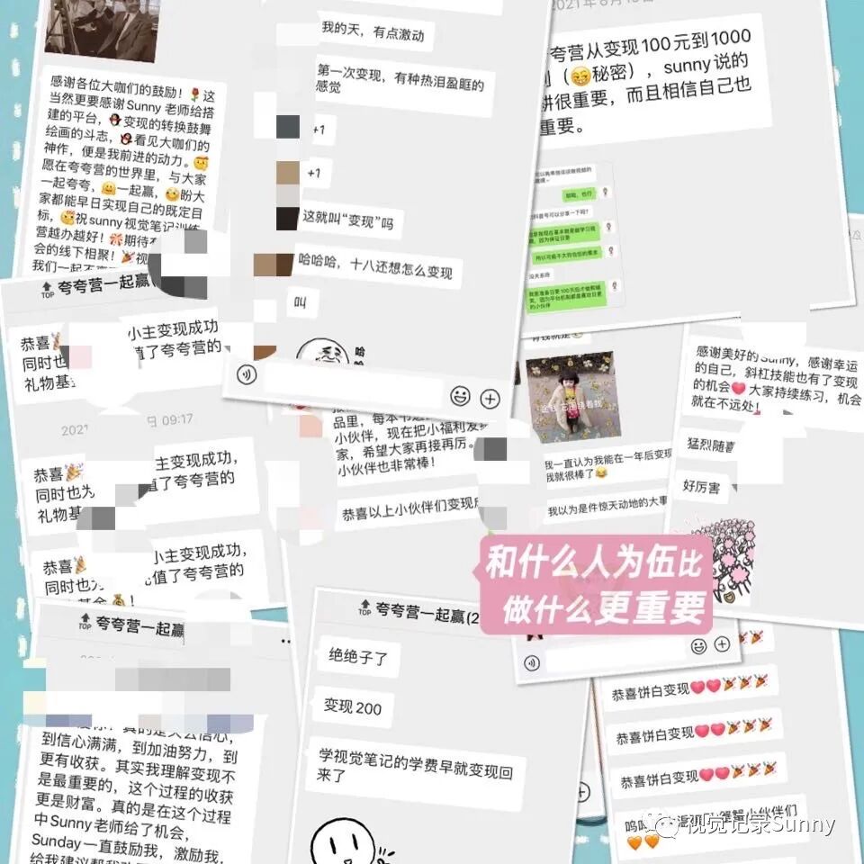 人的视野像手电筒,未知世界如茫茫黑夜。走在清凉黑夜里,大师们的智慧如闪亮的星星, 在头顶若隐若现,我抓紧自己的手电筒,照着脚下,一步步前行,偶尔见几个同路人,心生欢喜。——古典老师Hello,我是Sunny,一个野生的视觉记录师,同时也是一名外企HR。回顾2021过去的时间,我的身份,我的生活发生了翻天覆地的变化:前一天还在上班,隔天便休起了产假;从待产的大肚孕妇变成了新手妈妈;从自由支配时间,到每天疲于应对高需求的宝宝各种需求,但这一切都没有让我停下手中的画笔。那天我发了一张照片,怀里孩子,手里画笔,很多人都会发出感叹:Sunny,你不累嘛?我带着我亲爱的豆芽宝宝,背靠强大的幕后天团,为这个以视觉笔记为核心的社群持续努力着。当然,也带着夸夸营的伙伴们,在视觉笔记的道路上不断向前奔跑,每个人都在不同的方面努力有所积累和突破,像颗颗闪耀的星星,互相引领,持续发光。马上2021年就要画上句号,为了感谢所有夸夸营小伙伴这一年的厚爱,我和幕后天团的小伙伴们正在积极努力的筹备年会中,(咳,咳!据说还有还有现金奖励环节)希望给你们的2021,也添上精彩的一笔!大家敬请期待!2021年转眼就剩下最后2个月,但是并不意味着夸夸营社群运营的结束,而是新的开始,很多小伙伴在催促我:2022年的夸夸营什么时候开始招募,迫不及待想要参与啦!但是我还是希望2022年夸夸营能以更好的面貌呈现在大家面前,所以一直在不断的打磨细节,终于!全新的视觉夸夸营即将重磅推出!对视觉笔记感兴趣的你们,要不要来?夸夸营是2020年由野生视觉笔记师——我,首创的视觉笔记陪伴式社群,它一直被模仿,它从未被超越,它旨在带领同频伙伴们更有趣、有爱、有料地坚持做一件事,培养一个闪闪发光的技能。当然,夸夸营也为所有想拿起笔又怕自己手残的萌新伙伴们开放,通过引导鼓励式的打卡活动,帮助大家逐渐从小白蜕变成视觉笔记专业选手~12期主题带练:元素收集、画书、画海报、画头像、植物主题绘、软体字解锁,英文花体,手账,日历绘……28场直播同传(预计到12月31日,同传场数将达到50场),合作方包括:长沙图书馆、樊登读书、昆明烟草、中国微创业大会、新榜榜哥会,有赞新零售,中国企业法律顾问科技峰会……20场在线分享,主题包括:蒙特梭利教学;万物皆可“布尔逻辑”;短视频制作;护肤;减肥瘦身,一本绘本可以打造八节早教课;为什么要让孩子学美术;复盘与计划,如何用手机拍出好看得照片......24层画书项目大楼(预计到12月31日,楼层将达到30楼),完成了88本书籍9189张视觉卡片,合作方有(截止今日):人民邮电出版社 | 接力出版社 | 中国工信出版集团 | 机械工业出版社 | 人民大学出版社 | 麦格劳希尔 | 新曲线 | 新星出版社 | 蓝狮子 | 重庆出版集团 等30+次商稿合作,共有32位小伙伴通过视觉笔记技能成功变现。除了这些惊艳的数字,在夸夸营还有形式丰富成果多彩的共创项目: