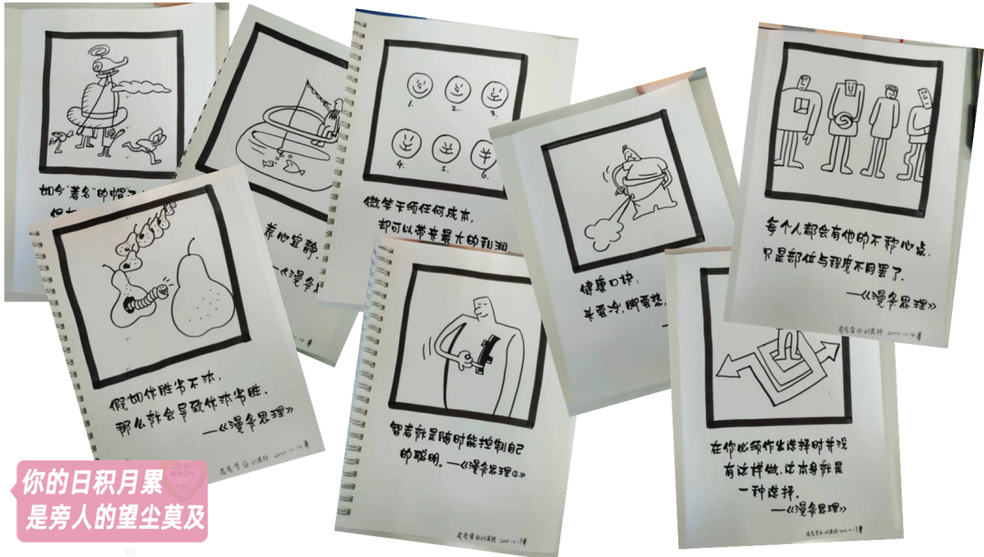 有一瞬间特别想把自己的感受分享给和我一样想做但是还不能做好的伙伴。想告诉他们,不要害怕自己现在不能完整呈现,视觉笔记是由很多元素组成的,如果我们从每个元素开始练起,只要不放弃,时间是最好的证明。