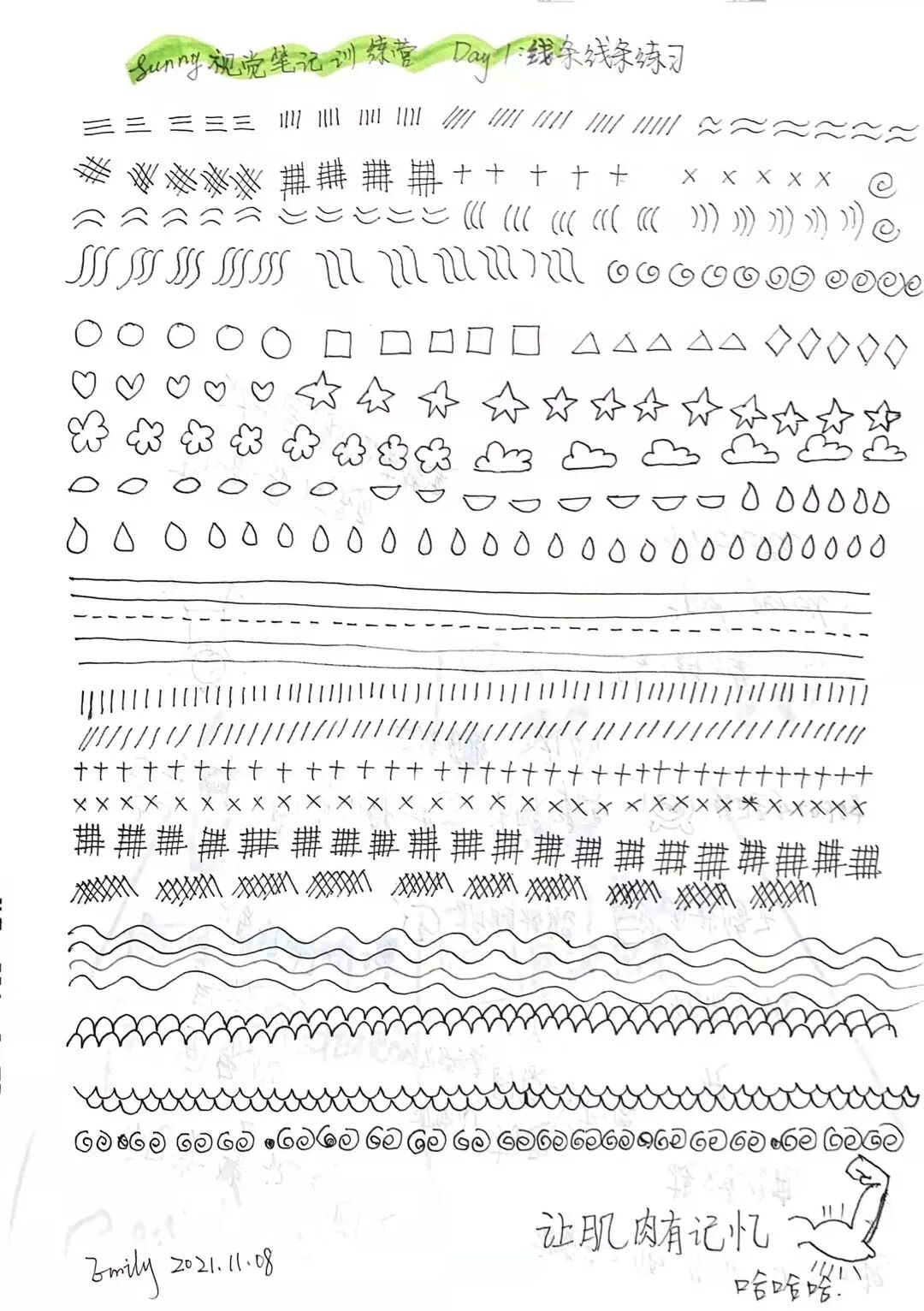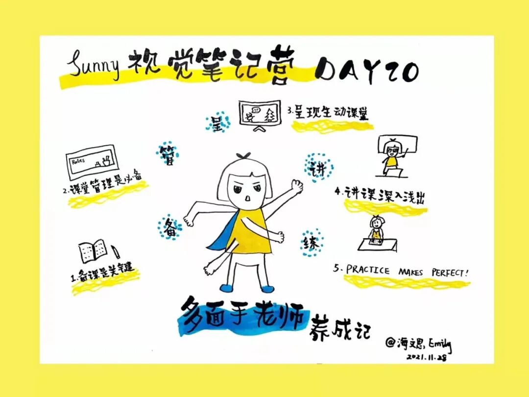 隶属于外貌协会的本人,「视觉笔记」这个形式早有看过,但是毫无心动之感。想来,可能是那笔记长得不得我心。但是Sunny老师公众号里面那些生动的小人所传达的读书笔记就不一样了。莫名我就喜欢你----心动感升起后,我默默关注了大半年,但仅限于潜水观看,从没想过绘画能力还是7岁水平的我,也有可能做视觉笔记。直到看到那么多有天赋的“小白”,用自己的实力证明了:“小白”也可以输出好看的"视觉笔记"这件事。再加上教培行业其实进入了一个很尴尬的时期,我想自己是不是可以做一些视频类的内容,视觉笔记这种形式可能是一个很好的知识载体,用来应对未来可能无法和学生面对面上课的情况。所以在处理完手头的一些学习考试后,“心动”终于转化成为了“行动”,11月初我终于跨入了Sunny老师的小白营,亲身体验了一番“小白”变成相信自己是“有可能”的人。- 专业度:Sunny老师用感冒后的磁性声音传递着深入浅出、实操性很强的讲解;训练营里根据每周时间节点甚至是节日安排的各种难度递增的作业;助教云朵老师贴心的提示和精心安排的各种分享加餐、周末互动活动等;各位富有魅力的点评老师还有我嫡亲的点评老师Ian老师,每天及时、细致、专业的反馈、鼓励和分析,帮助激活了一个积极活跃、勇于的自己。- 精神激励:Sunny老师自身从绘画小白成长为视觉同传高手的经历,云朵老师的每天2个钟、以年为单位的练字分享,千千老师的成长分享彩蛋,都给人一种稳稳的安定感。因为她们证明了“对的付出终会有收获”,而且比你优秀的她们仍然在坚持耕耘,你有什么资格不努力?![]()