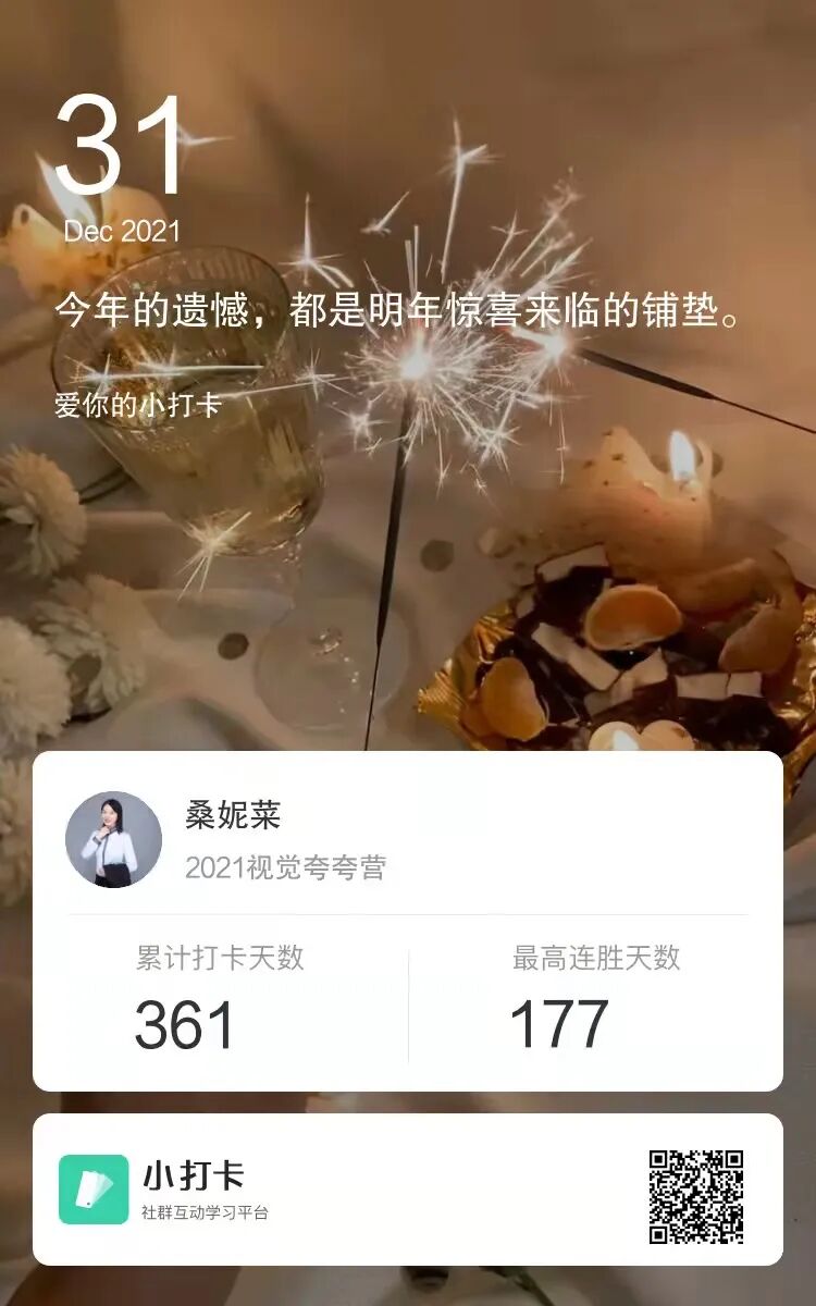 一件小事坚持去做,也是一种能力,当我的朋友圈昨天发到365/365时,我觉得这是一年结束后,给自己跨年最大的礼物,那就是坚持!