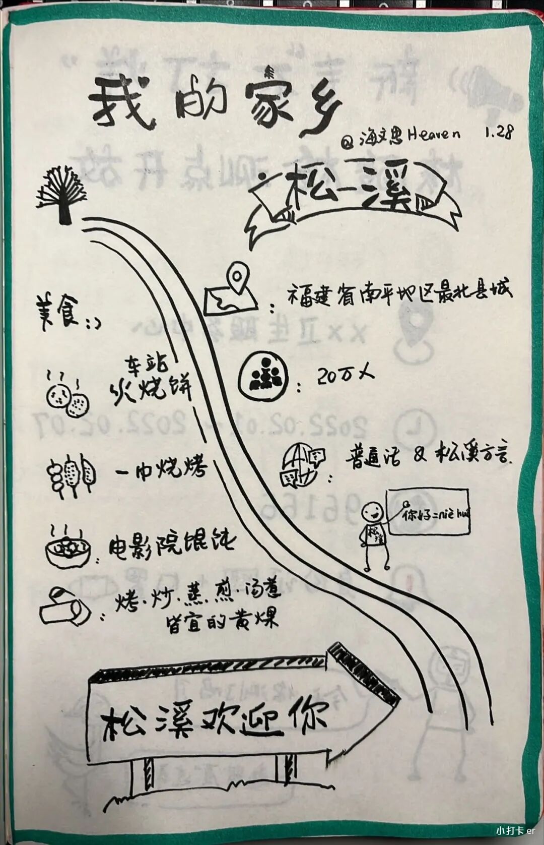收获四:自我梳理的机会。很多打卡主题,例如,自我介绍,介绍家乡和工作等,都是很好的自我梳理的机会。在这个过程中,我们是在借由笔记对外表达你是怎样的人。在做自我介绍这个主题时,我发现最近工作上的变故让我的自我认知出现了一个卡点。作为一个K12英语培训老师,在“双减”形势下,我的内心很纠结,甚至是灰心。但在跟着视觉笔记进行自我梳理后,我惊喜地发现,我最后的落脚点是在大家对我的鼓励上,是家人、学生和小伙伴对我的鼓励。这让我深信,未来是有希望的!