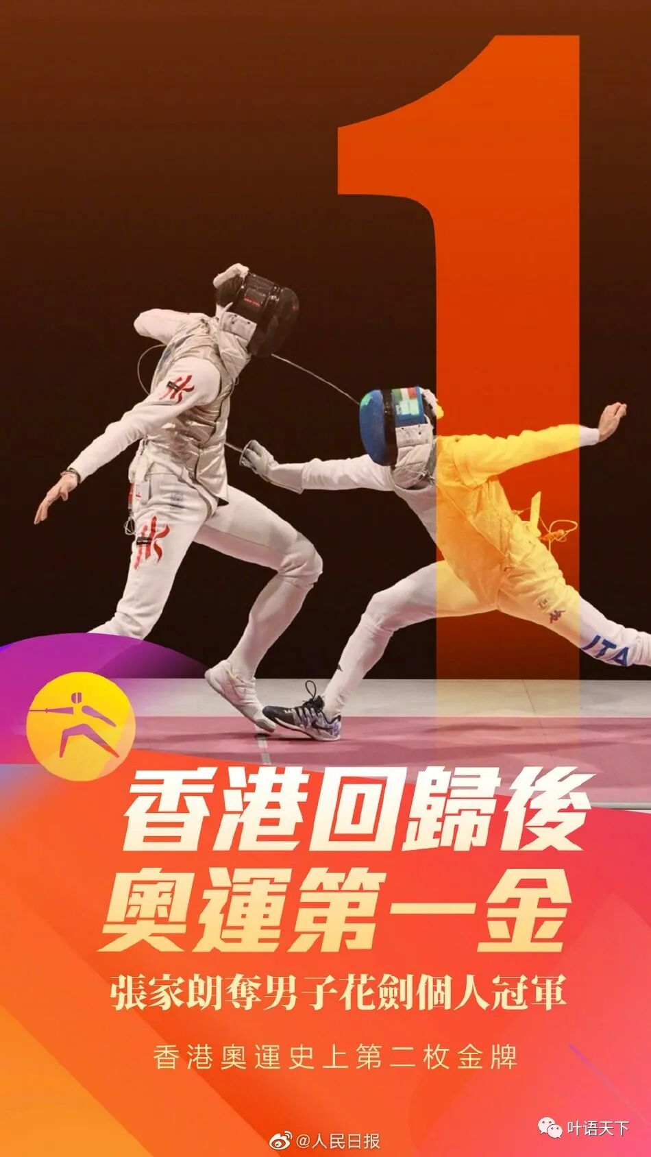 24岁的张家朗,以15-11击败了上届奥运金牌得主、意大利达尼名将埃莱·加罗佐,为中国香港拿到了东京奥运会首金。这,也是中国香港代表团奥运史上的第二枚金牌,更是香港回归祖国后的首金!可喜可贺!中国香港奥运代表团,继续加油!