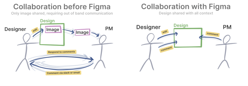另外一个变化是,浏览器优先的策略使得非设计师的协作成本大大降低了,浏览器是天然跨平台的,我们再也不需要下载和学习使用 PhotoShop 或者 Sketch 这种臃肿专业的软件。
