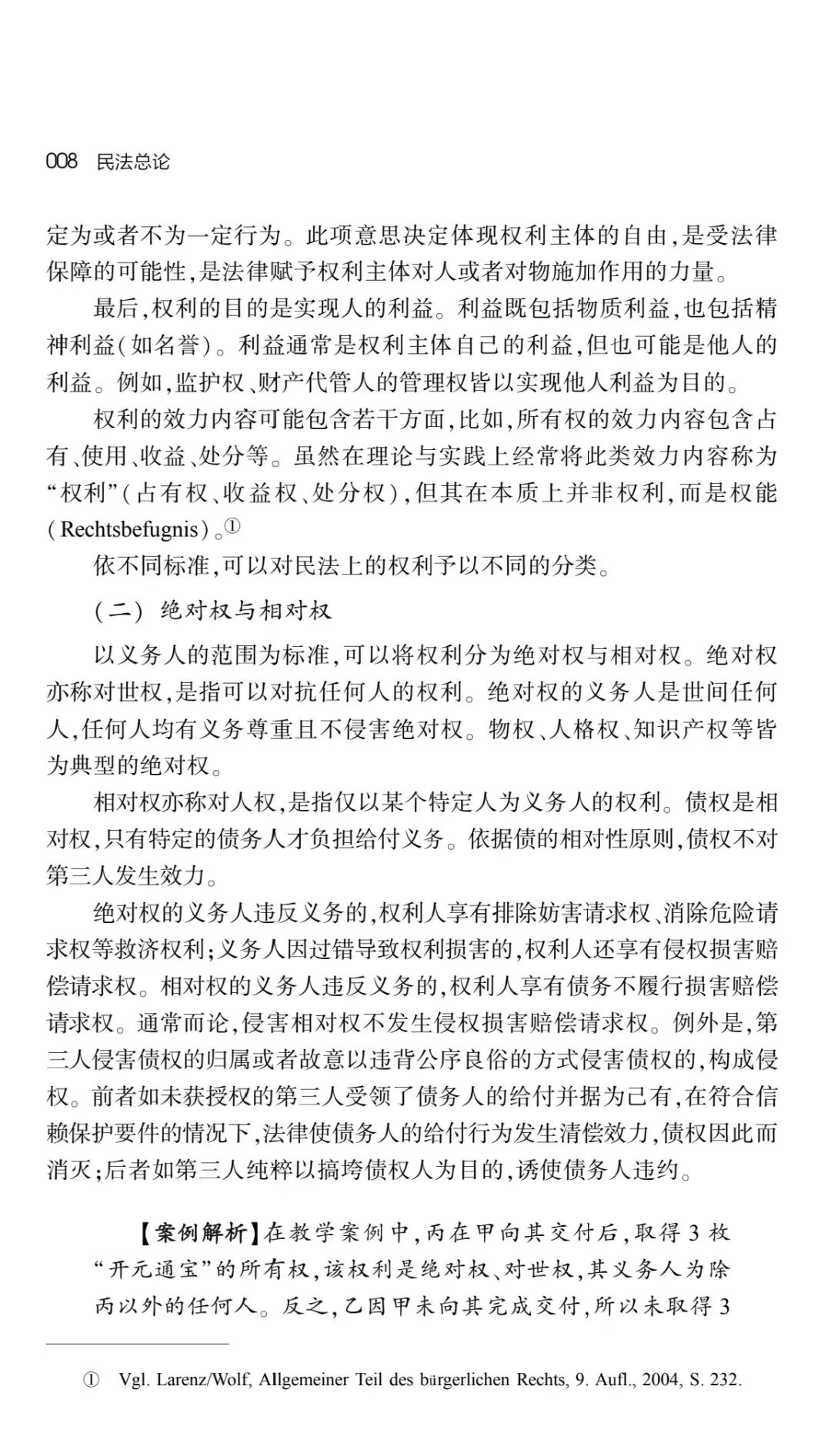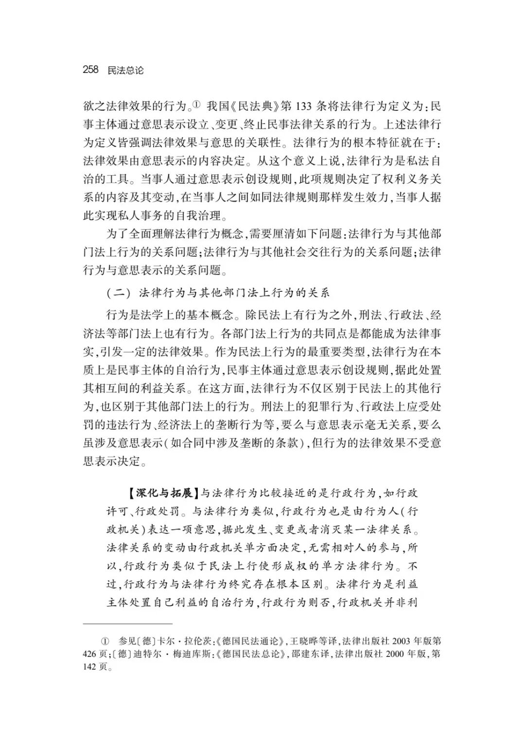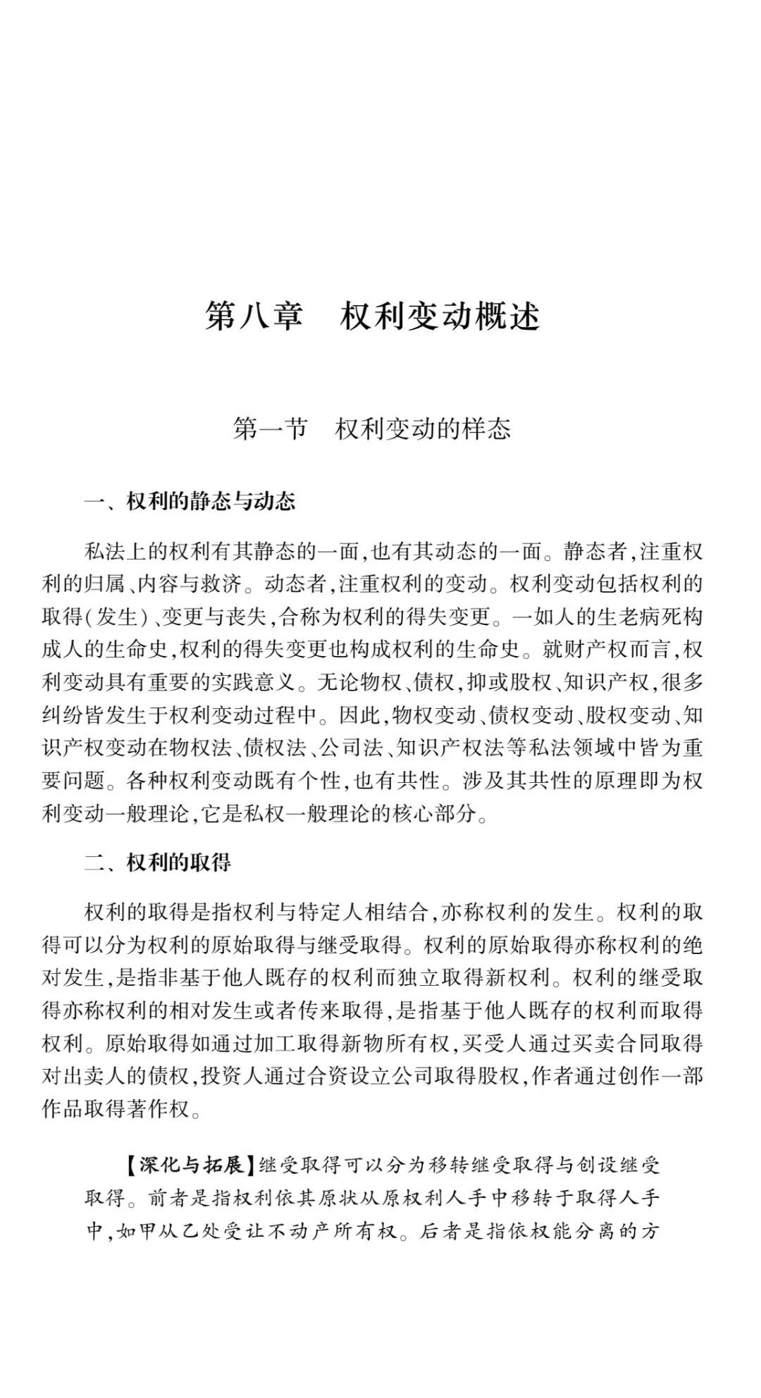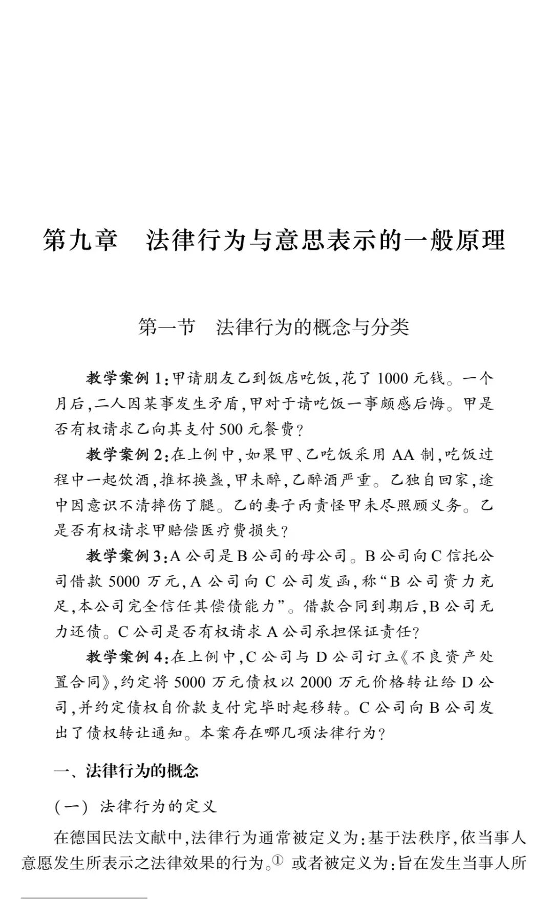 与国内既有的民法教科书相比,本书采用新的编写体例。首先,每节的开头设置了一个或者数个教学案例,提出若干问题,引导学生思考,在寻找答案的过程中学习民法原理。其次,对于民法总论中的重要概念体系,本书制作了大量图表,帮助学生形成逻辑记忆。最后,本书以不同的字体区分了学生必须掌握的民法基本原理与可以拓展、深化的民法原理或者比较法、法律史方面的知识。希望借助上述手段,可以帮助学生对民法总论进行立体式的观察,降低民法总论学习的难度。