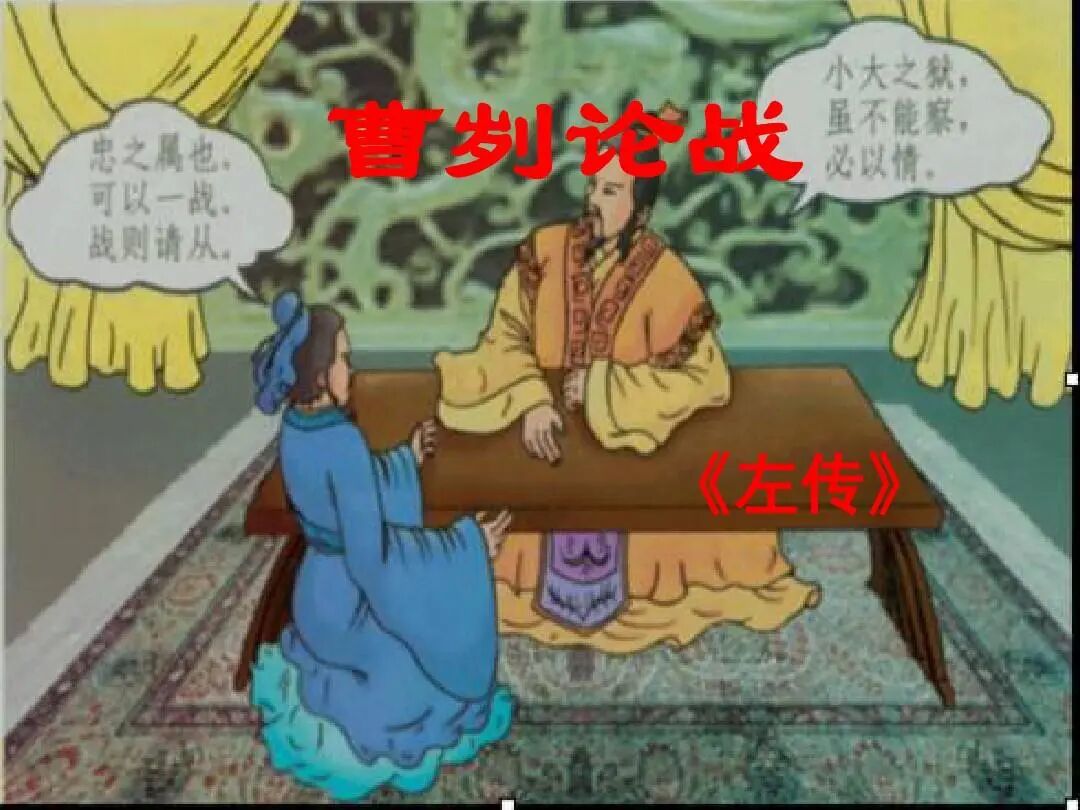 鲁庄公和他共坐一辆战车,在长勺和齐军作战。鲁庄公将要下令击鼓进军。曹刿说:“现在不行。”等到齐军三次击鼓之后。曹刿说:“可以击鼓进军了。”齐军溃败。鲁庄公又要下令驾车马追逐齐军。曹刿说:“还不行。”说完就下了战车,察看齐军车轮碾出的痕迹,又登上战车,扶着车前横木远望齐军的队形,这才说:“可以追击了。”于是追击齐军。