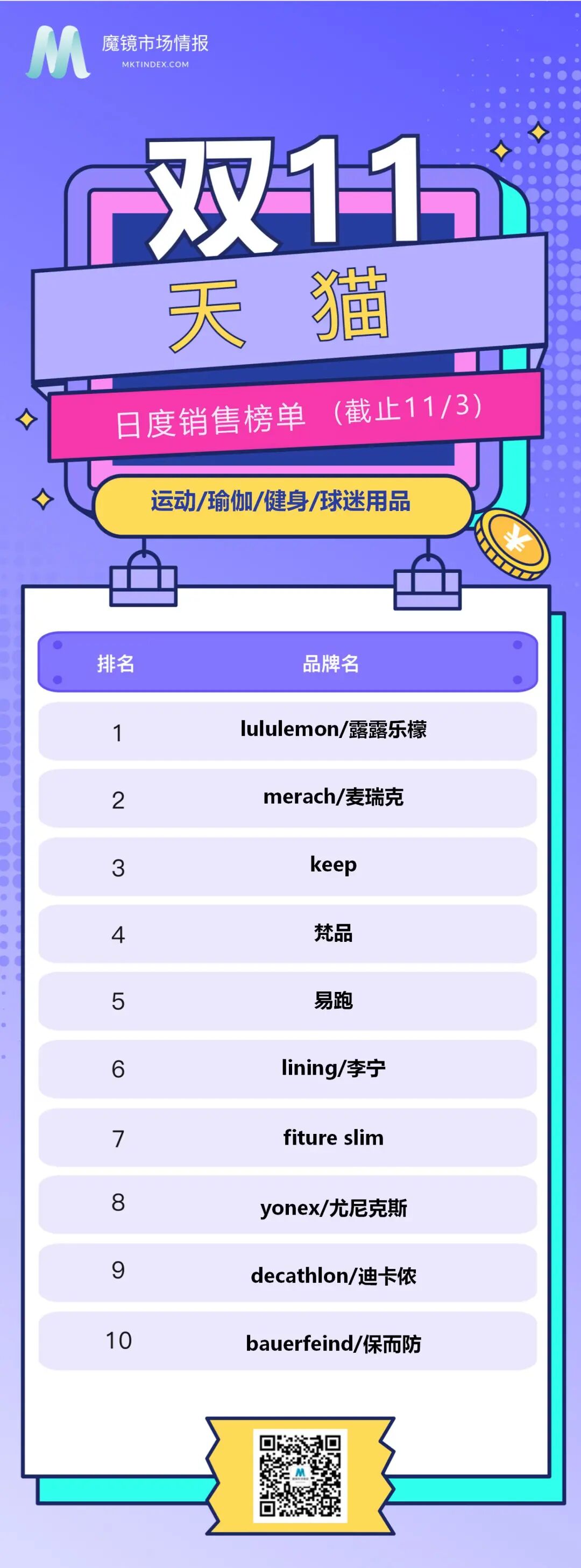 今天,魔镜市场情报为大家盘点一下运动户外、服饰鞋包行业中,天猫平台截至11月3日含预售的累计销售额品牌排行。