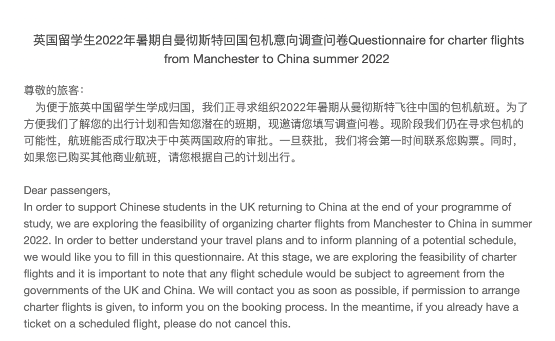 3月31日(周四)北京时间12:00,英国曼彻斯特大学官方微信官宣:即将开展2022年暑期包机回国意向调查。