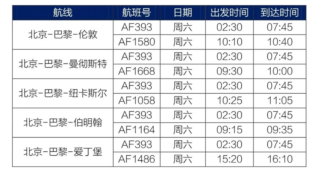 此外,近日法航还发布了经法国返英航线汇总,具体信息如下: