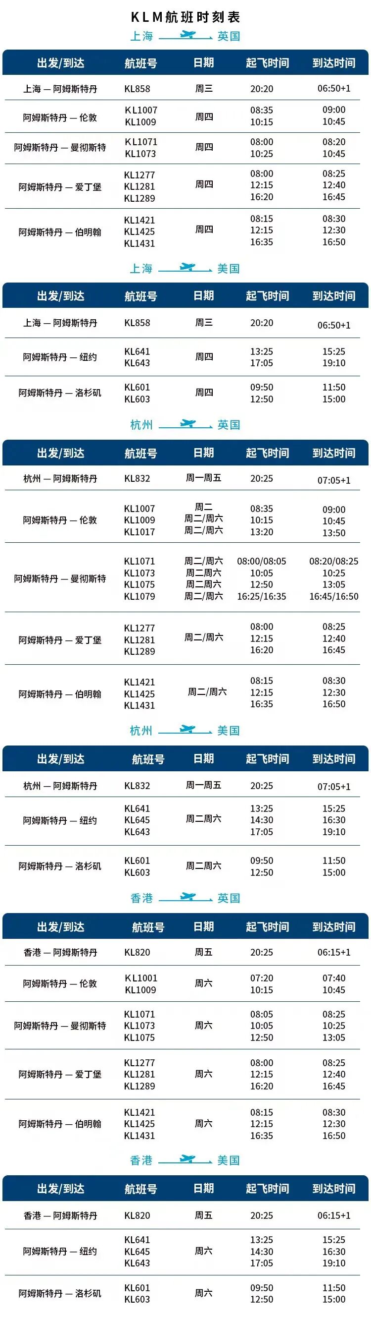 开学季荷兰皇家航空也给出了最新航班时刻表,助力大家返校返英(可从上海、杭州和香港出发),具体信息如下: