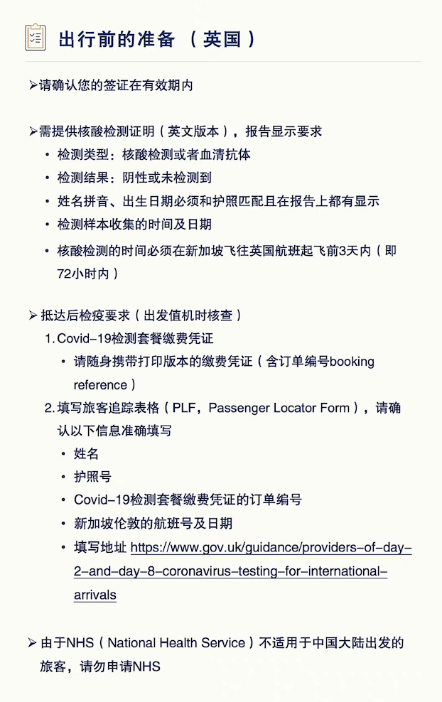 - 无论是否接种过疫苗,旅客均需在登机前3天之内完成新冠核酸检测并提供完整信息的报告,同时需提前购买英国入境检测包及填写入境信息表(PLF);