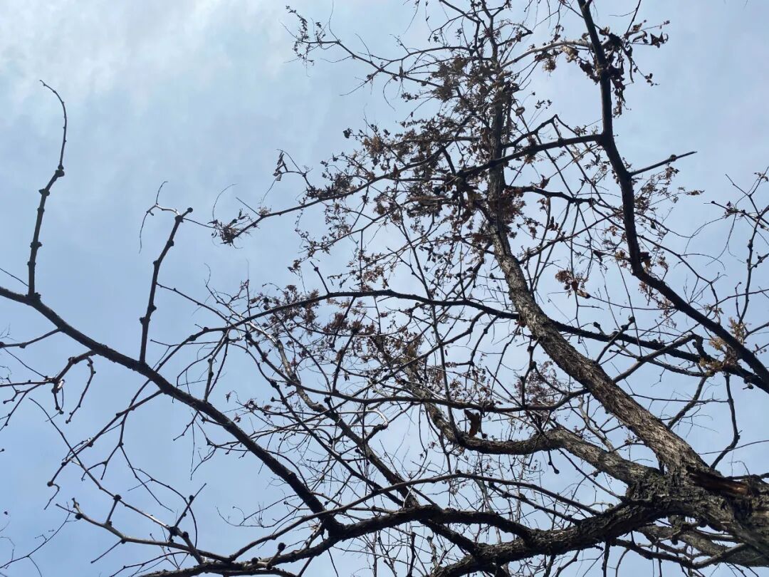 枣树们也生病了。抬头就能看到,大多枣树的树枝上长出了细密的棉絮状的东西,李思君请懂园林的朋友来看过,对方说这是真菌感染,说明枣树的根部已经开始腐烂了。但即使是这样,每年一到5、6月份的时候,这些枣树还是会长出嫩叶,在盛夏时节变得茂密,“表面上看树还是长得很好,但是不结果了。”
